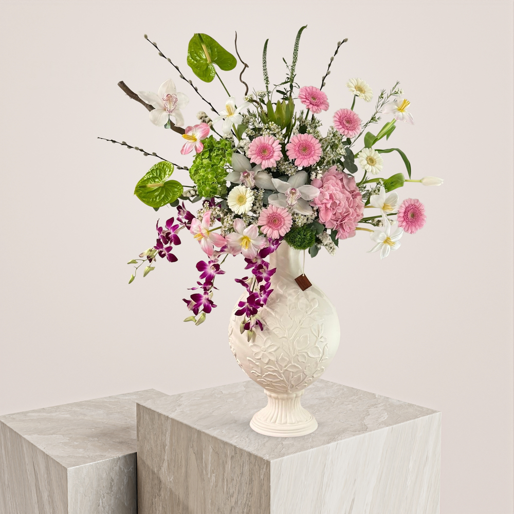 A vase that contains gerberas, tulips, orchids, hydrangea, anthuriums and wax flowers.
