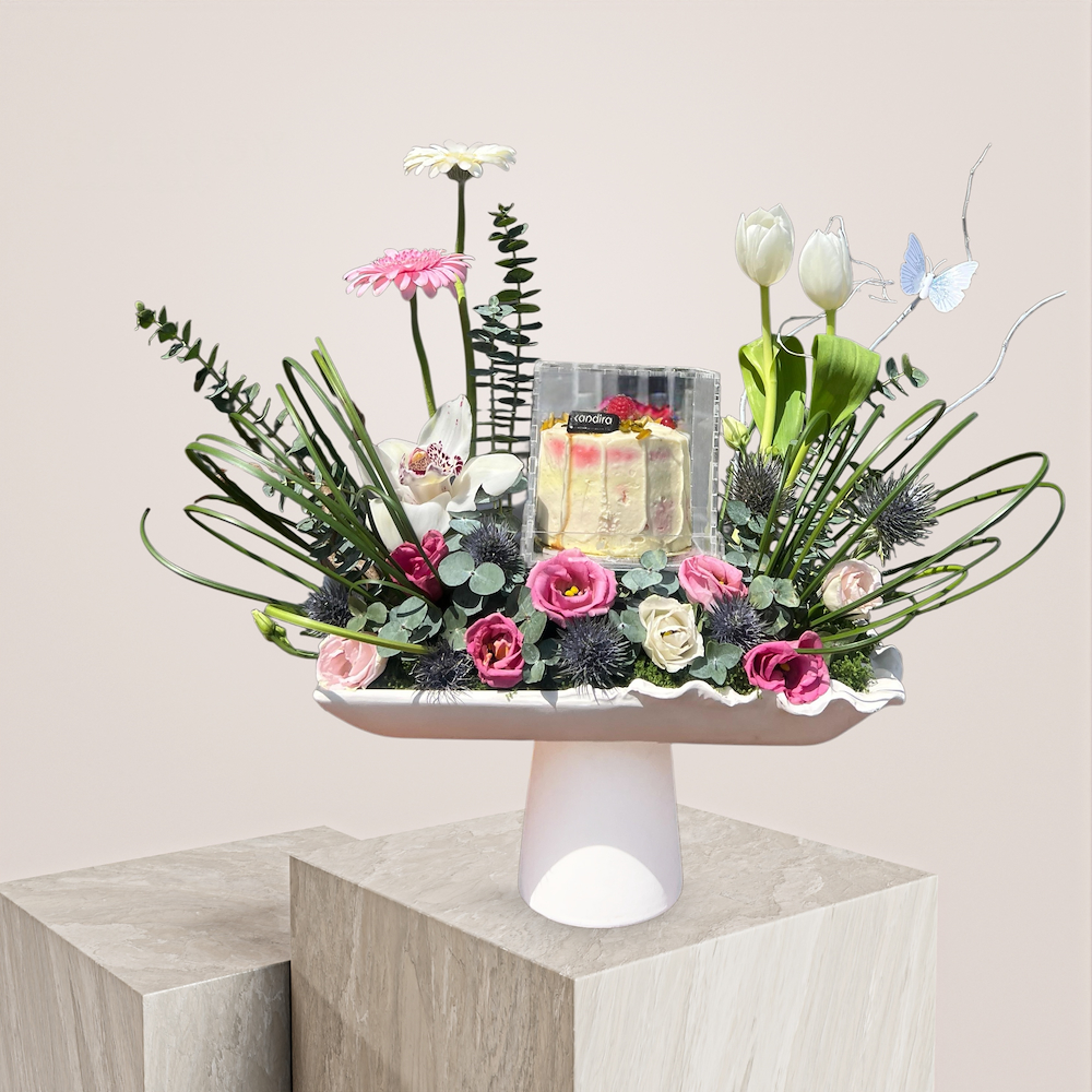 A vase that contains roses, tulips, gerberas and orchids along with a cake.