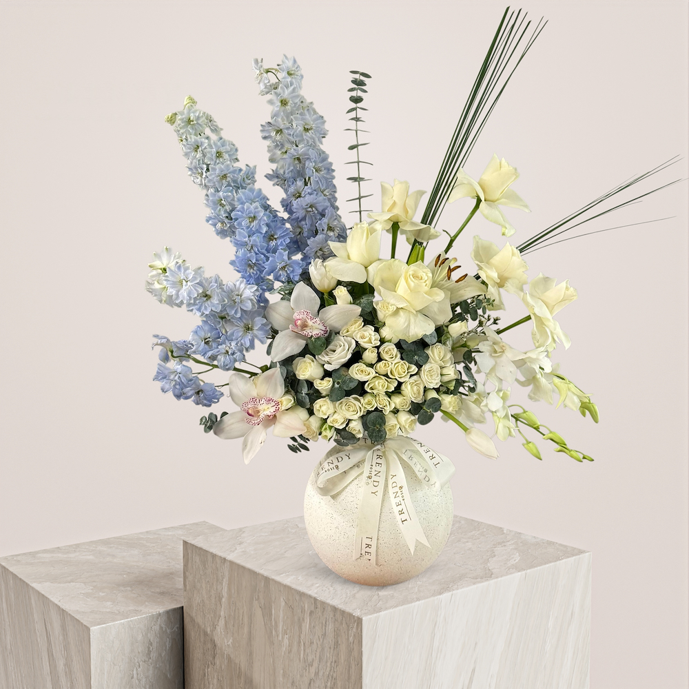 A vase filled with delphinium, baby orchid, baby roses and cymbidium flowers.