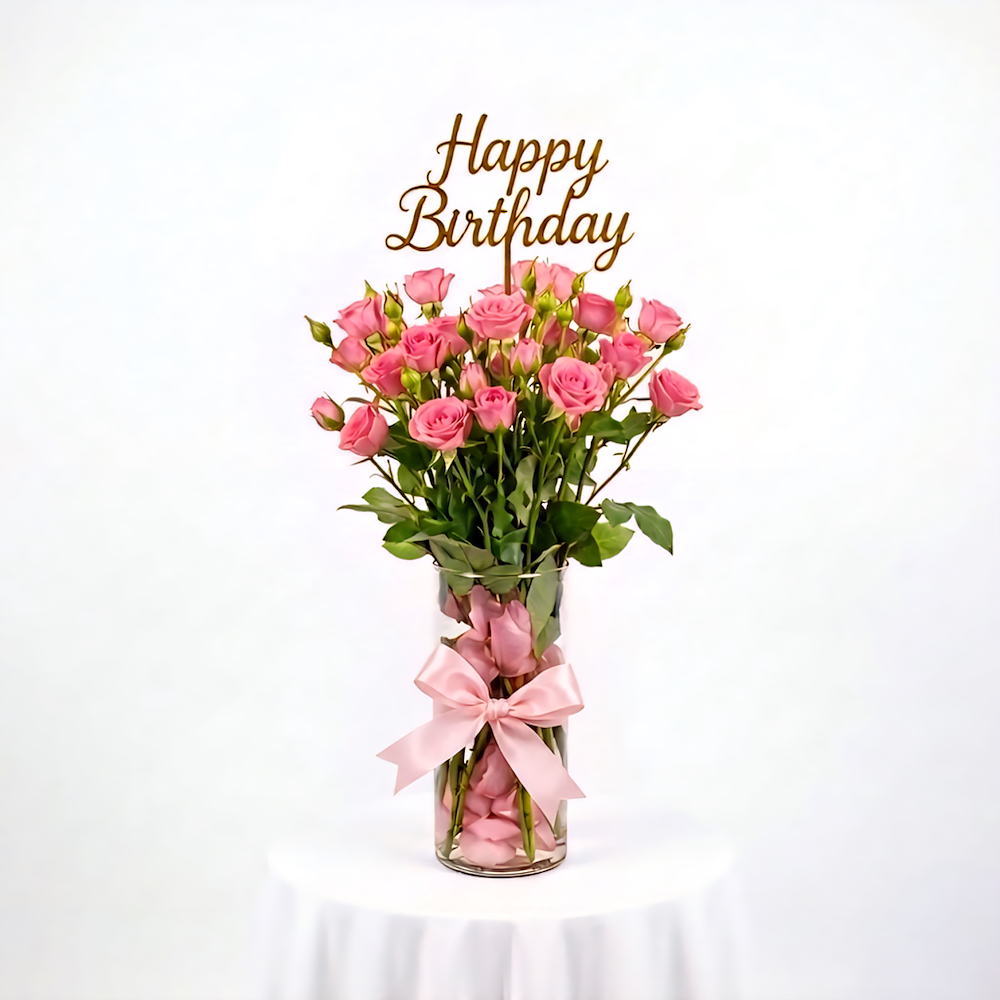 A vase containing pink baby roses, arranged beautifully with a birthday topper.