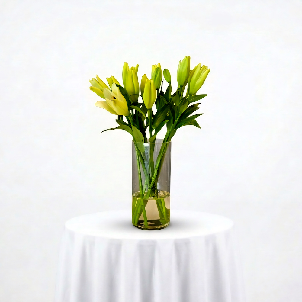 A vase containing lilies, arranged beautifully. Note: the flowers might arrive closed and will open within time.
