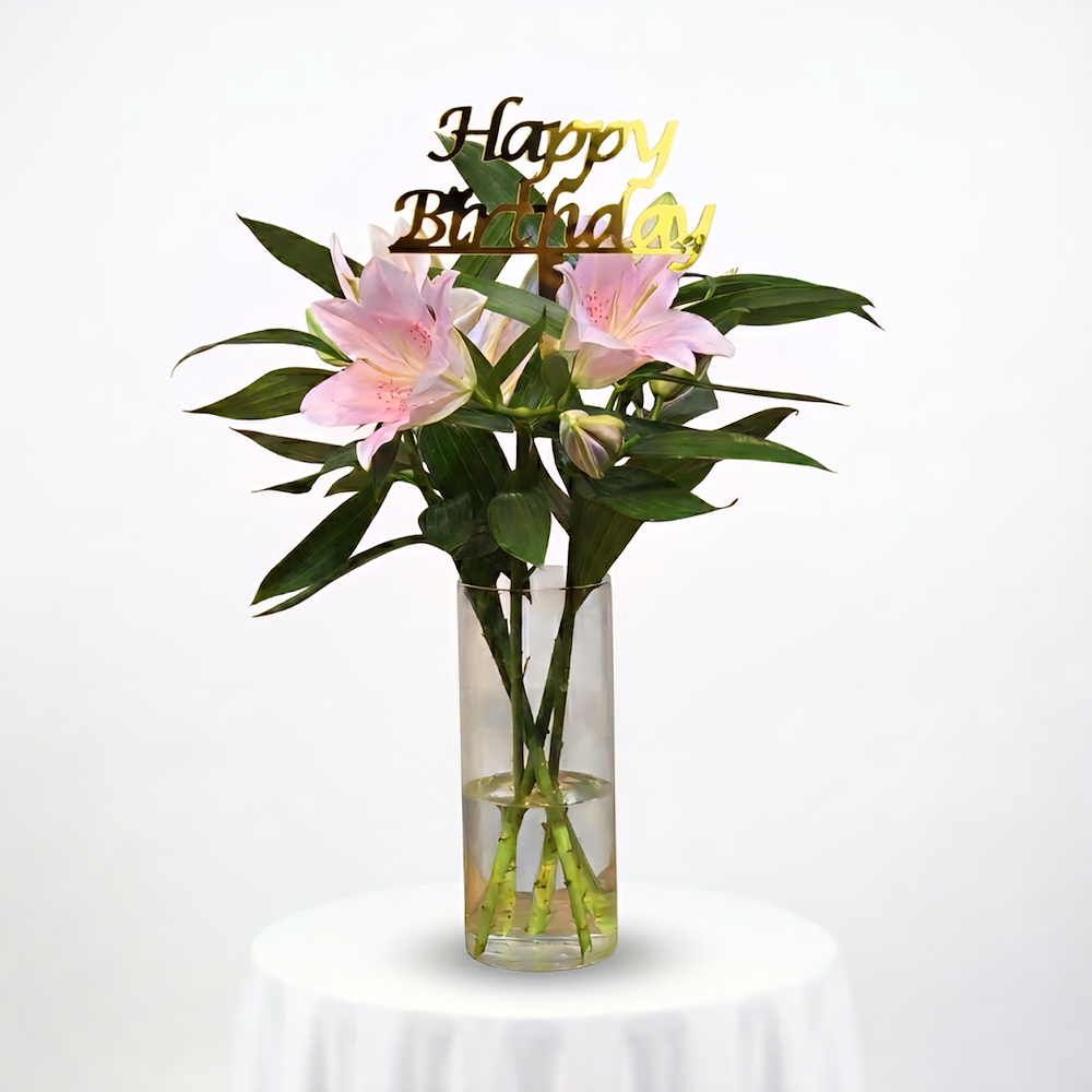 A vase containing pink lilies, arranged beautifully with a birthday topper. The topper can be changed.