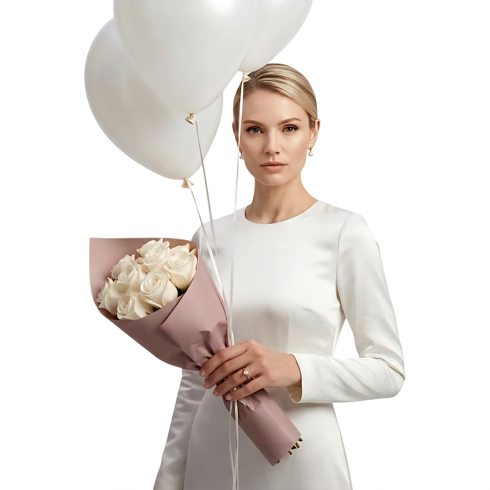 A hand bouquet containing white roses, arranged beautifully. Comes with helium balloons.