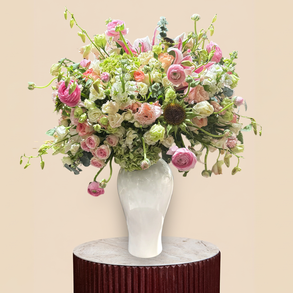 A luxurious vase arrangement of imported flowers (roses, spray roses, hydrangea, Casablanca lily, ranunculus, lisianthus, orchid, matthiola, sunflower, and eucalyptus) that radiates femininity and elegance. It blends soft shades of pink with classic touches of white and fresh green accents, creating the feeling of a natural garden. arranged in a free flowing, organic style that reflects effortless beauty and refined taste, making it the perfect choice for luxurious gifts and special occasions.
