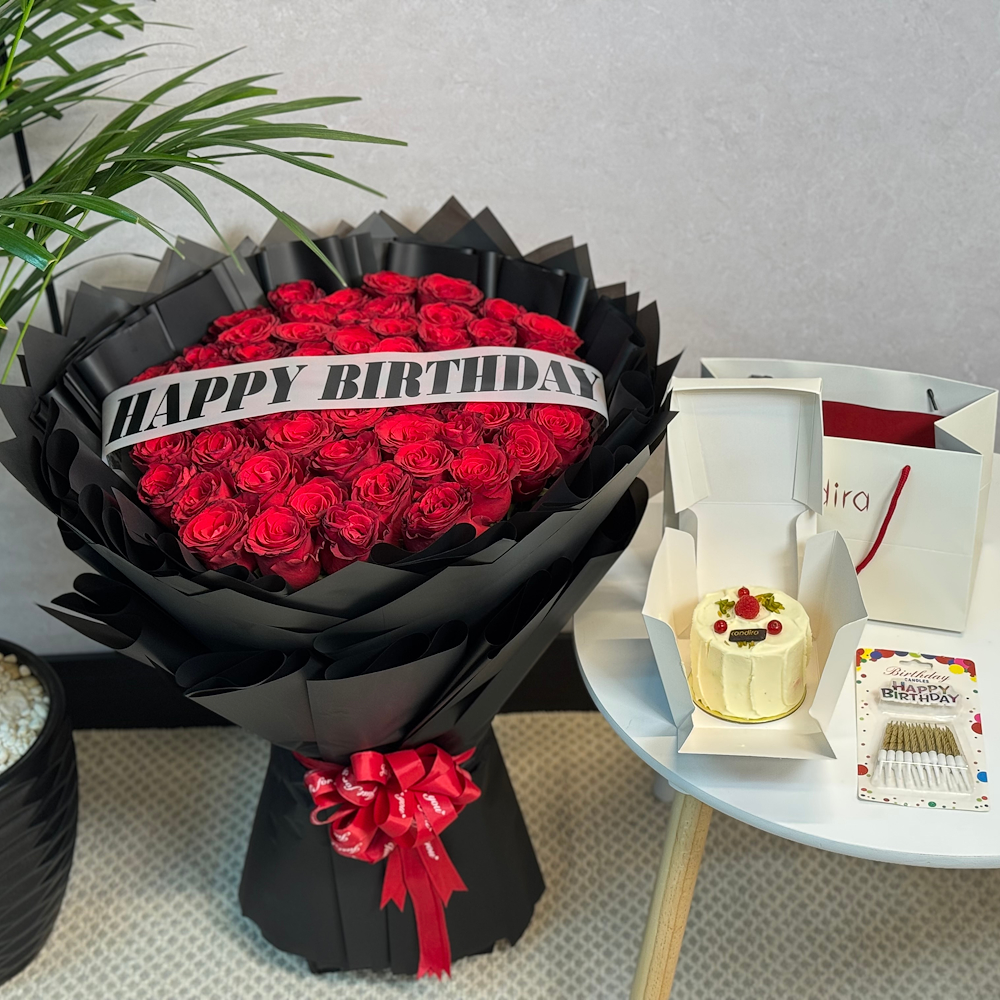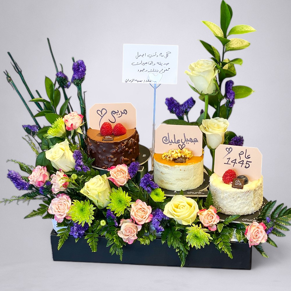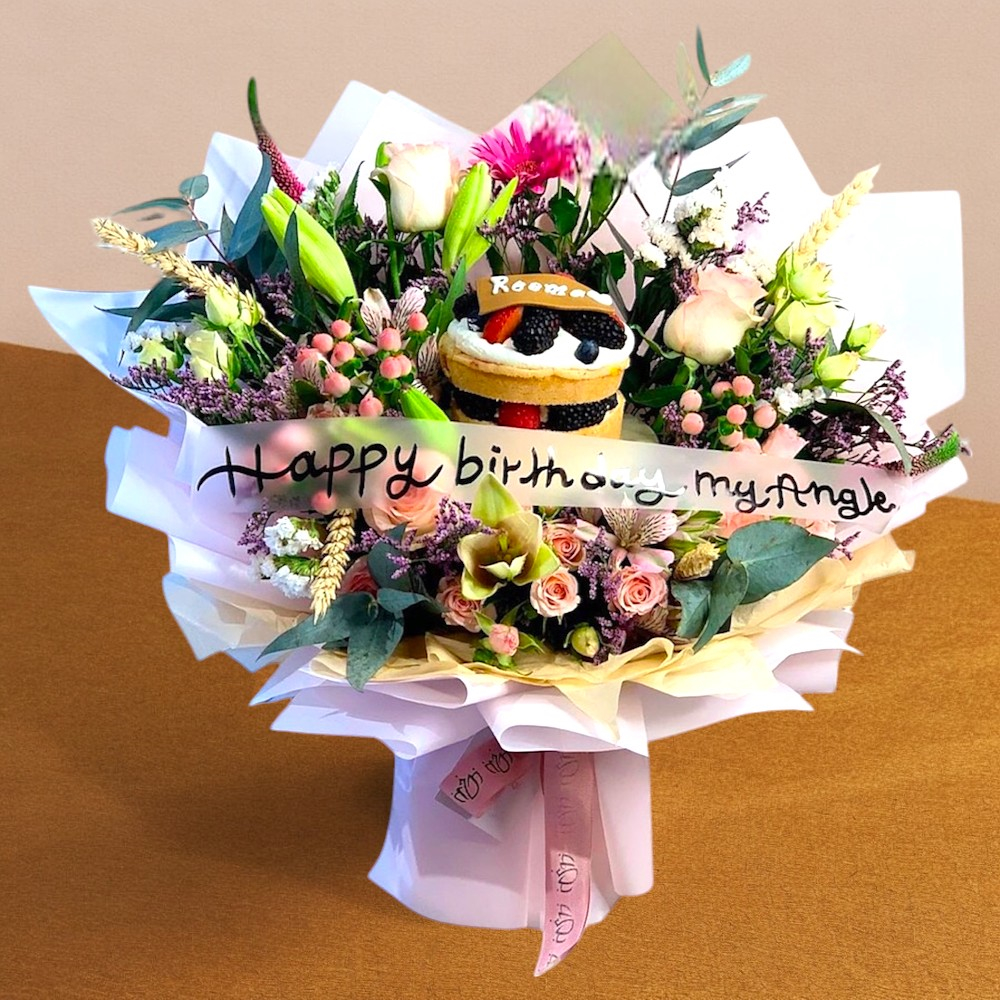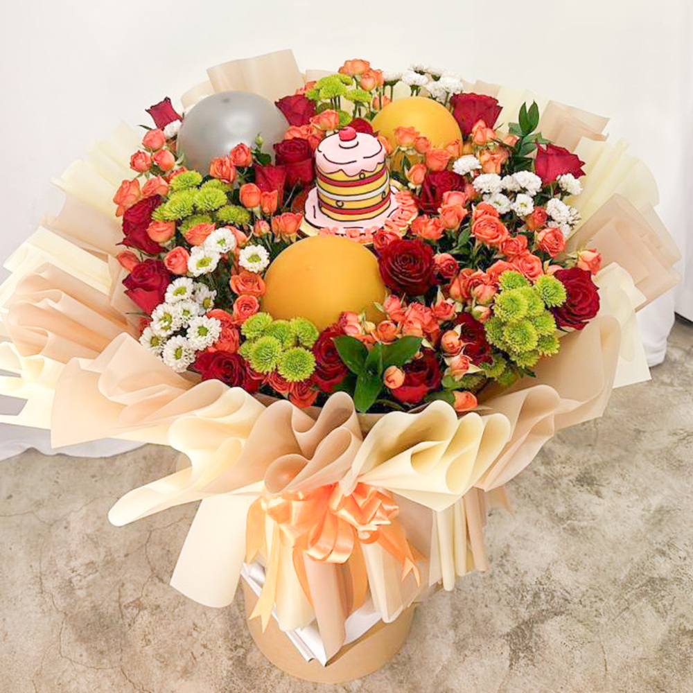 A distinctive vase containing baby roses with a celebration cake from Munch.