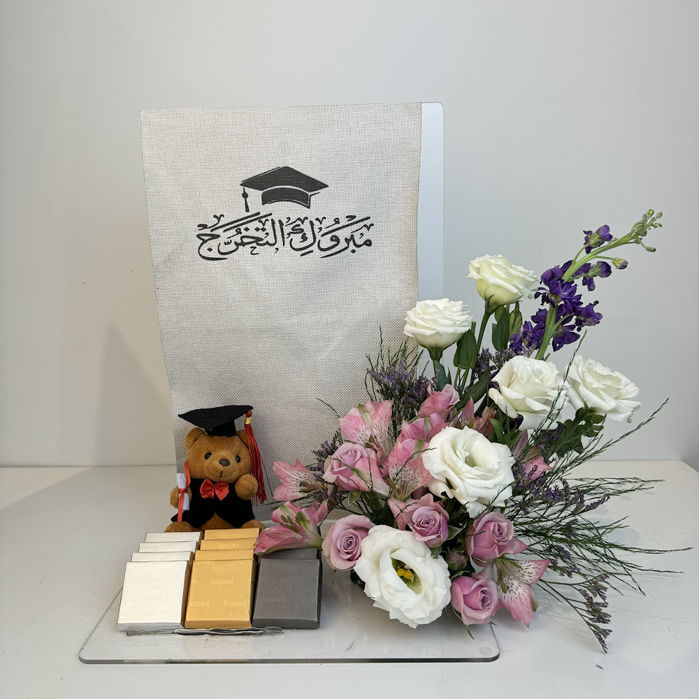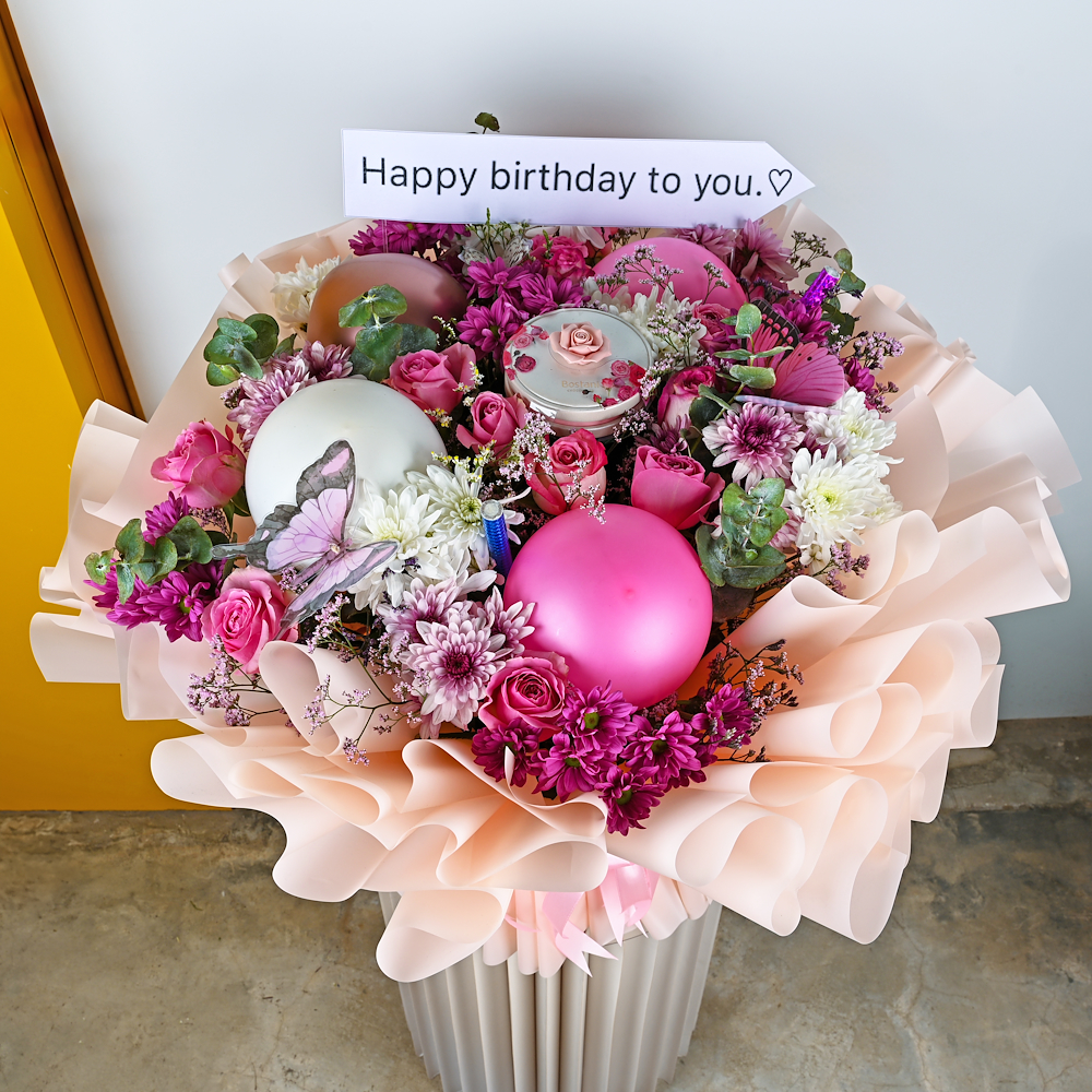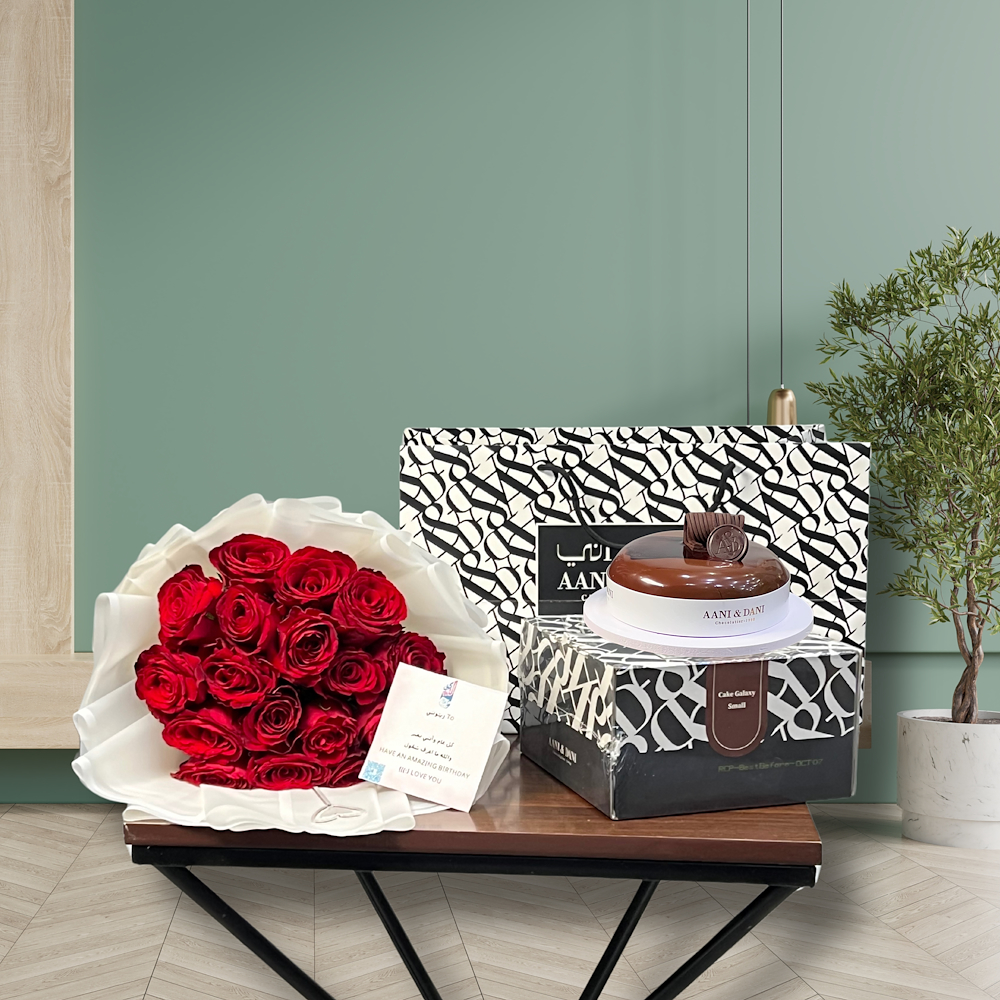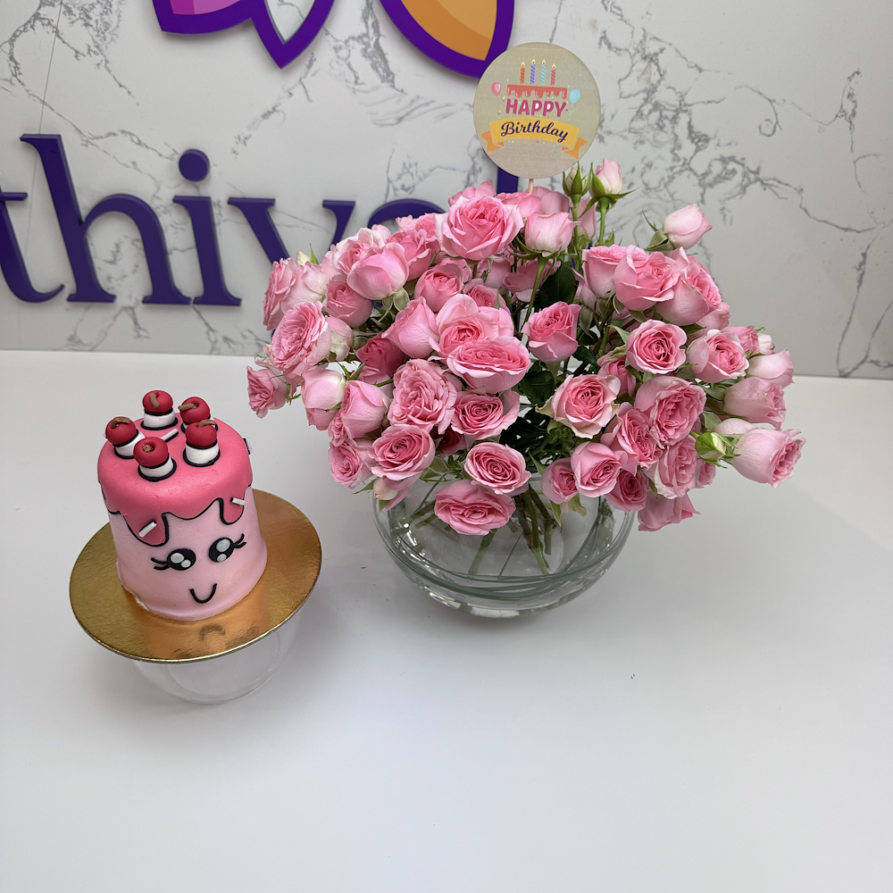 A distinctive vase containing baby roses with a celebration cake from Munch.