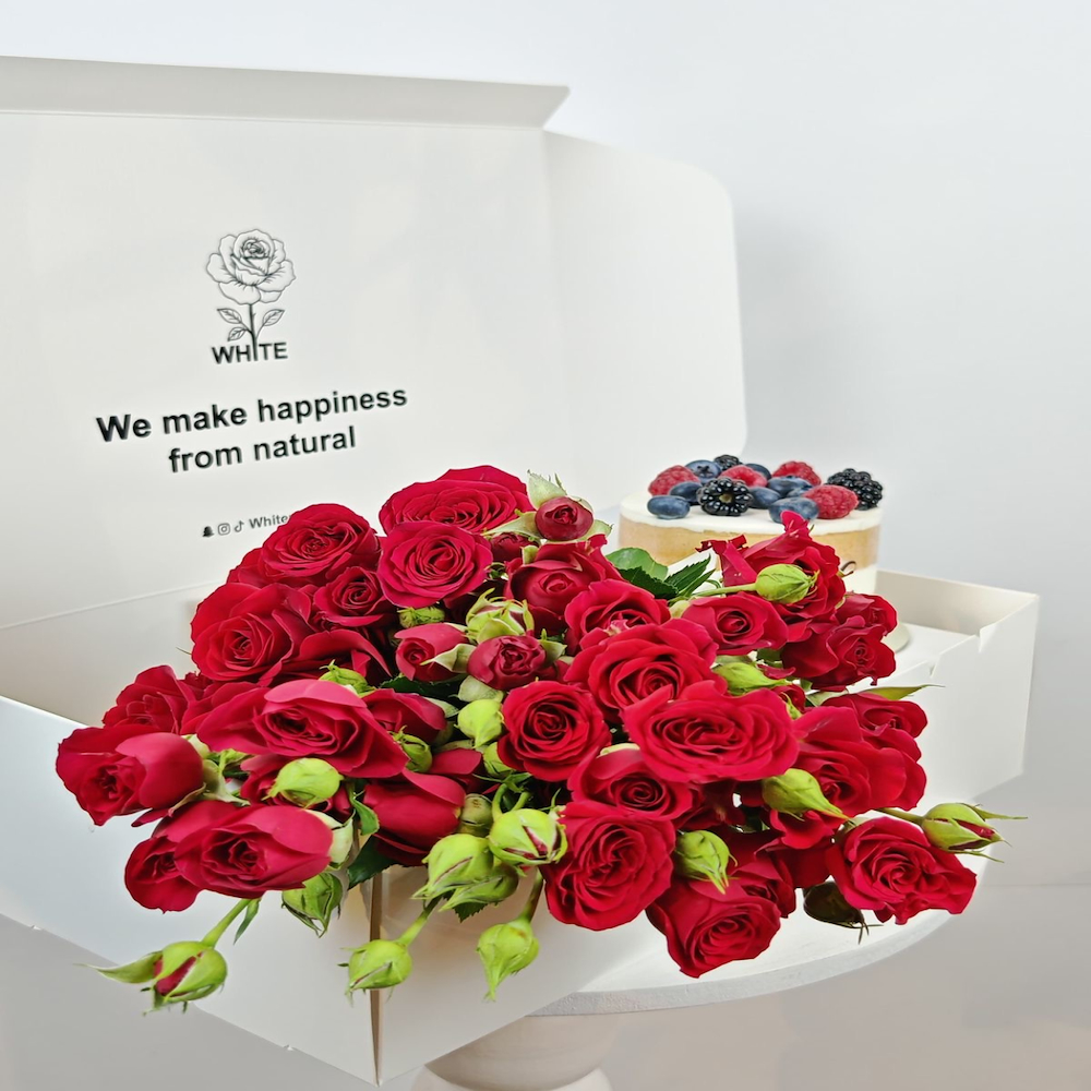 A gift that expresses love with a luxurious character that combines high taste and natural elegance consists of a ganach cake with fresh berries with soft layers of rich cream and formed fruits blueberries blackberries and red berries presented inside an elegant box with a design bearing the identity of the white rose store the gift is decorated with ten branches of red baby rose flowers which symbolize warm feelings and sincere passion perfect for presenting on love occasions birthdays graduation parties or as an expression of thanksgiving.