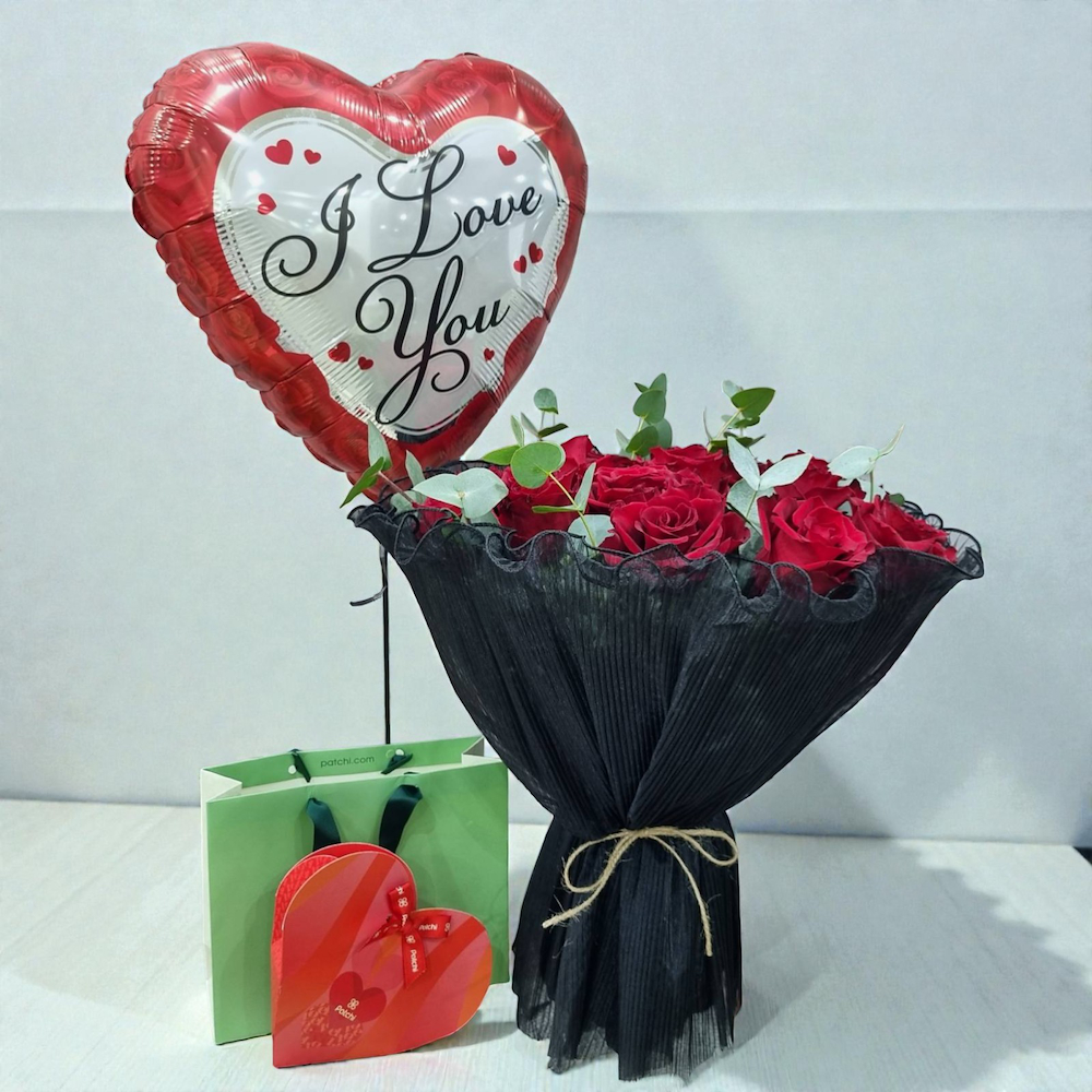 A hand bouquet containing red roses, arranged beautifully. Comes with Patchi chocolates and a heart-shaped helium balloon.