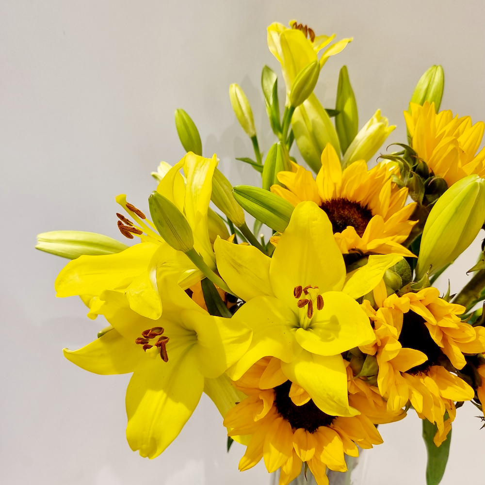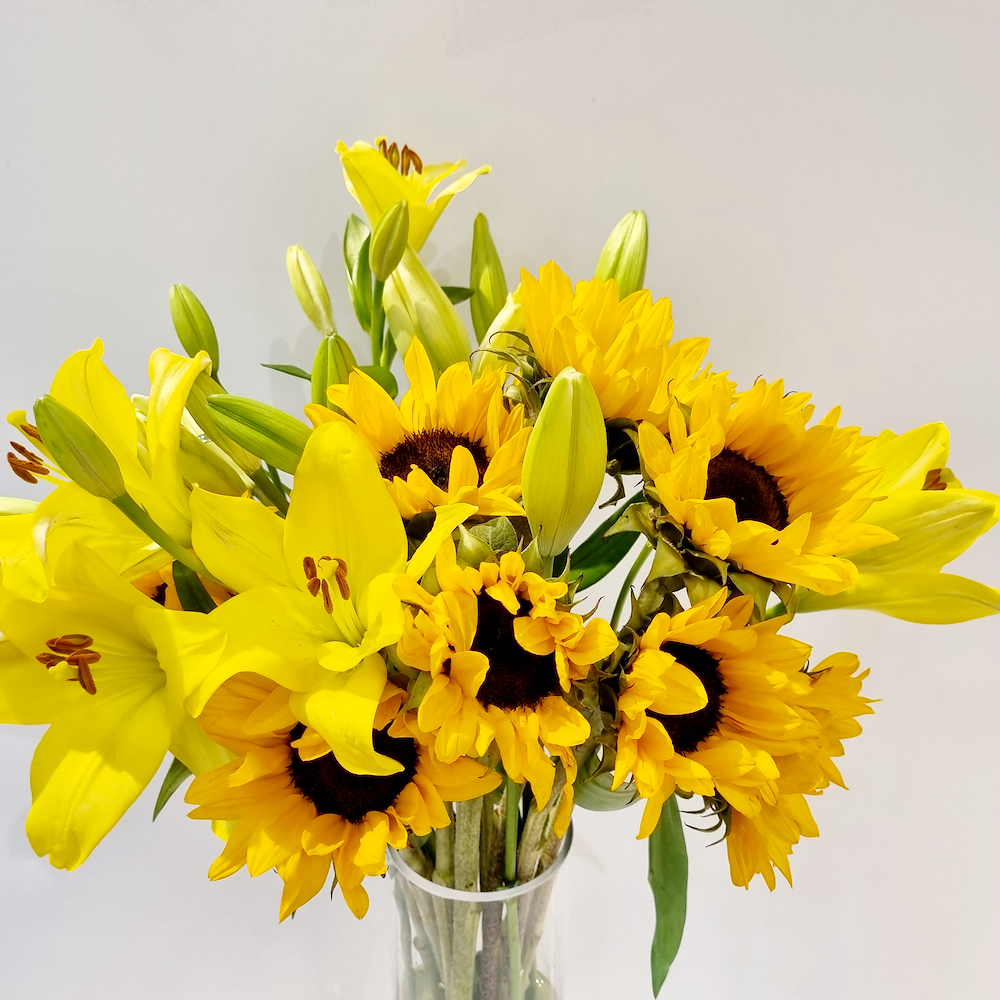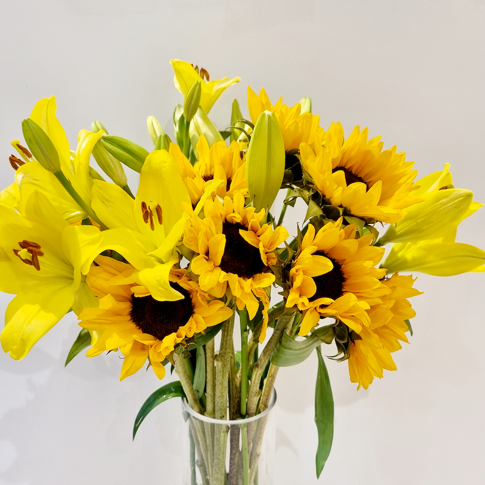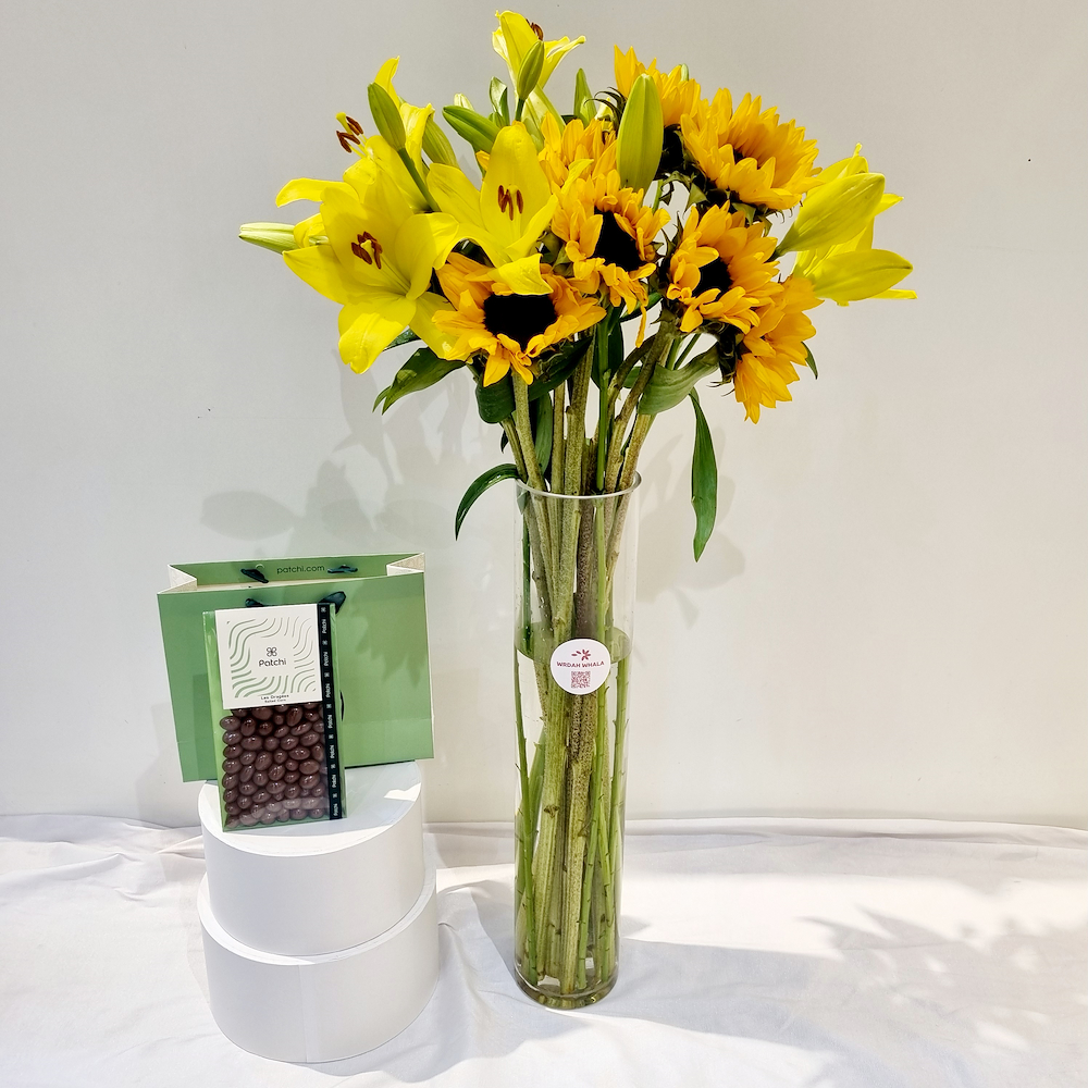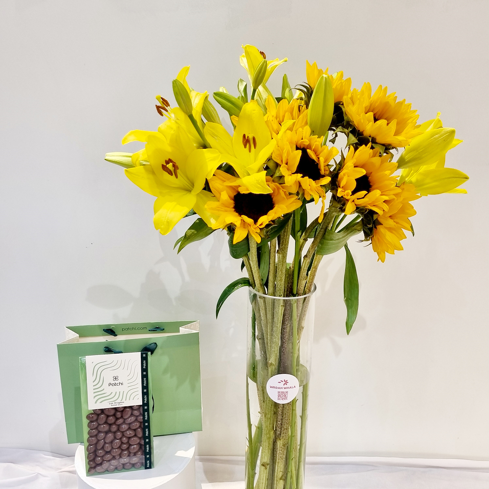 The gift includes sunflowers and yellow liliums carefully arranged inside an elegant glass vase. It is accompanied by a 250-gram package of salted corn coated in dark chocolate, in addition to a bag of milk chocolate with salted corn from the “Le Dragee” brand, making it a distinctive and ideal choice for gifting.