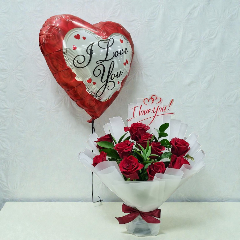 A hand bouquet containing red roses, arranged beautifully. Comes with a heart-shaped helium balloon.