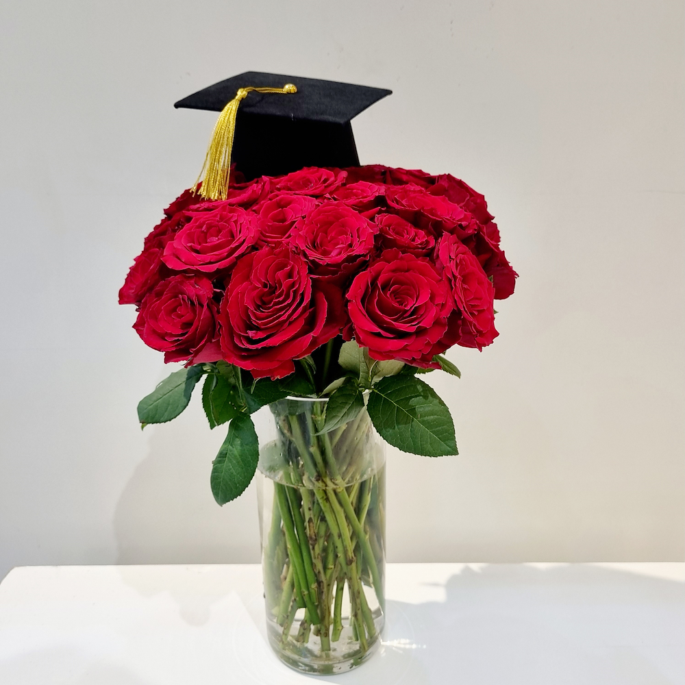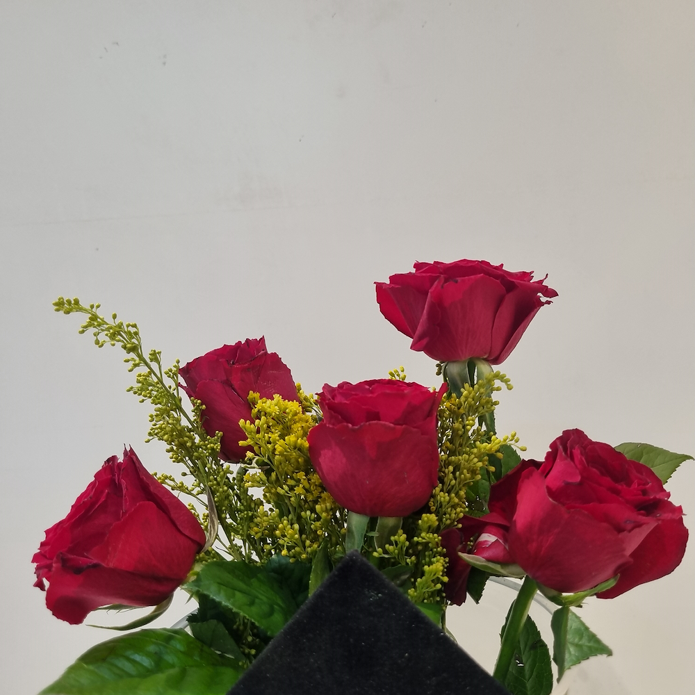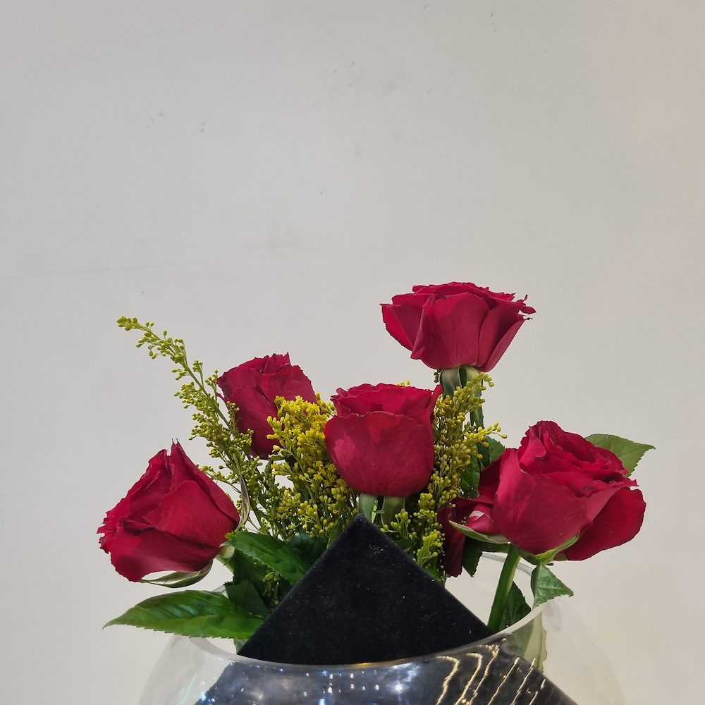 A glass vase filled with red roses.