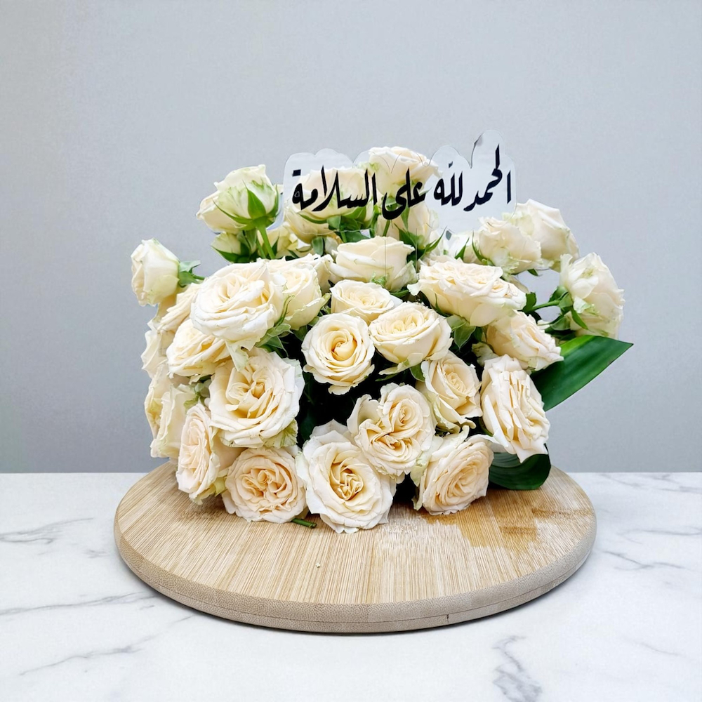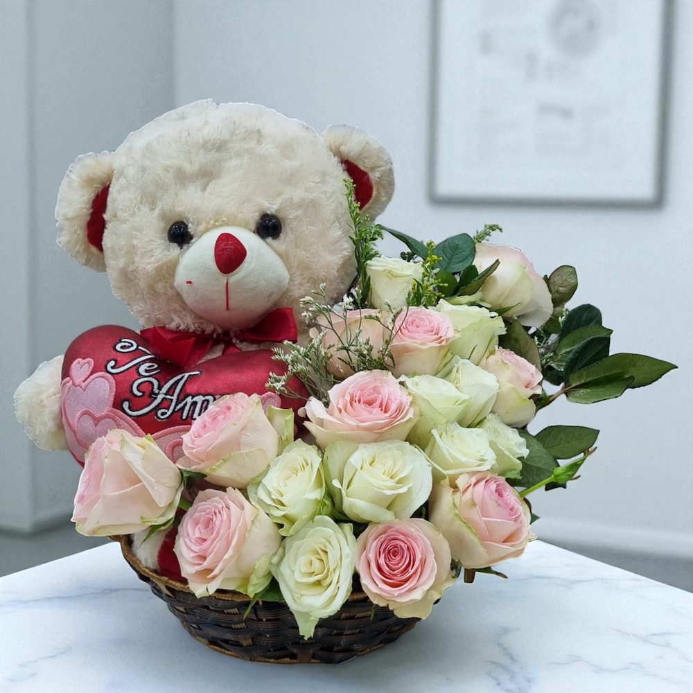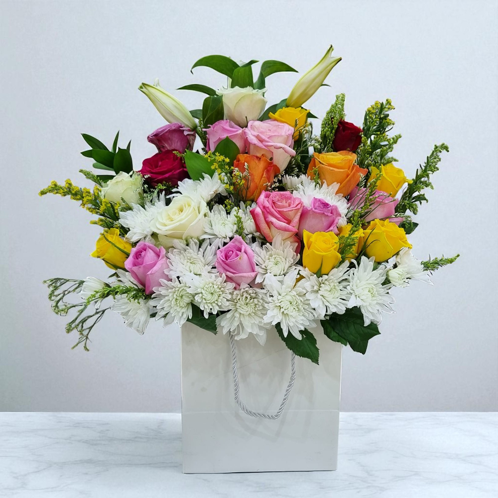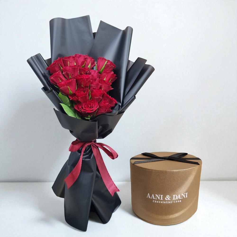 A glass vase filled with red roses.