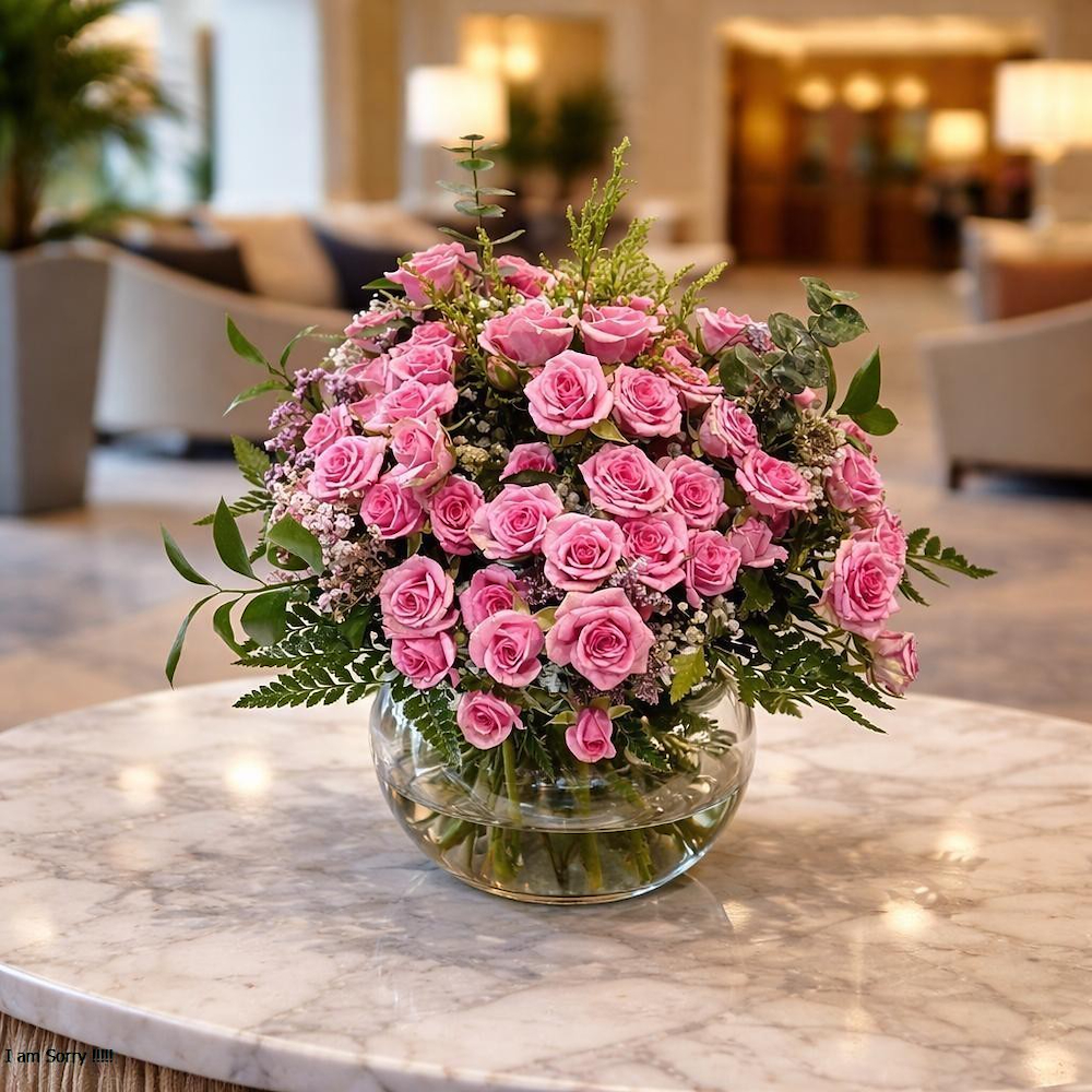 An elegant vase featuring baby roses and greens.