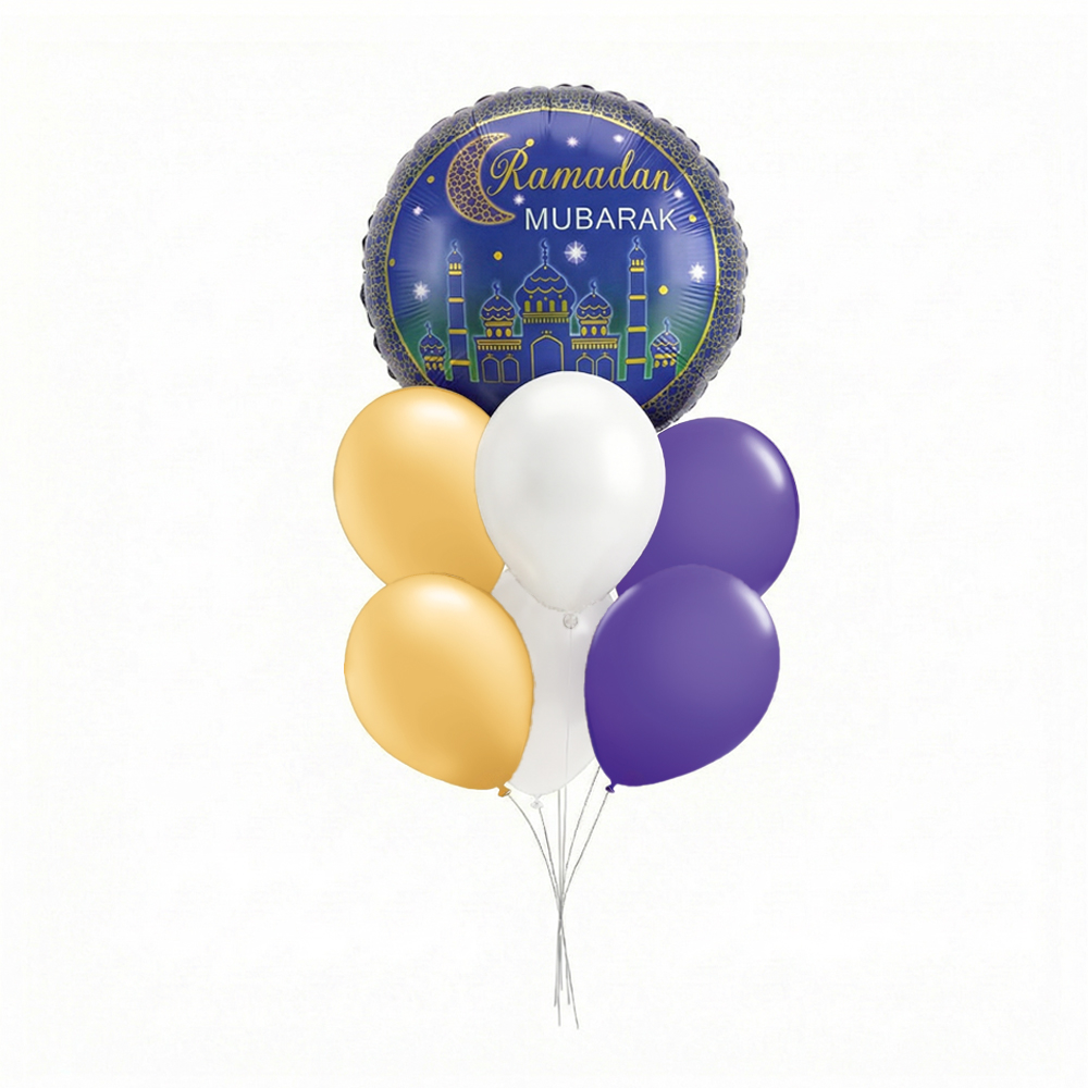 A balloon bouquet consisting of nine balloons in white, gold, and pearl colors, with a distinctive foil balloon in gold.
