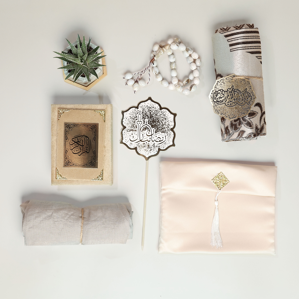 A leather bag featuring a zipra plant, beads, a prayer mat, and a Quran.