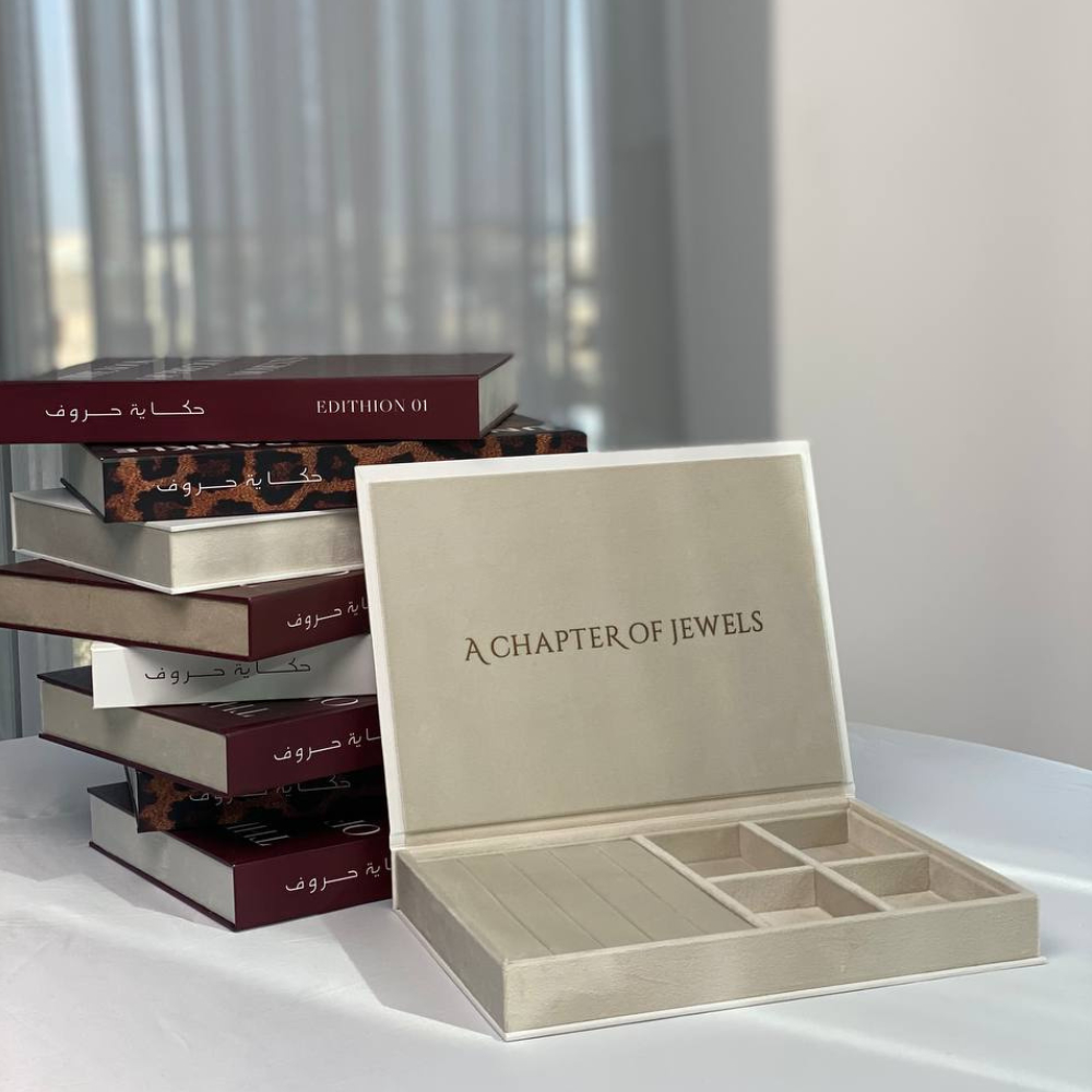 A book-shaped box lined with luxurious suede. Its elegant design adds a touch of sophistication, and it can be personalized with a name.