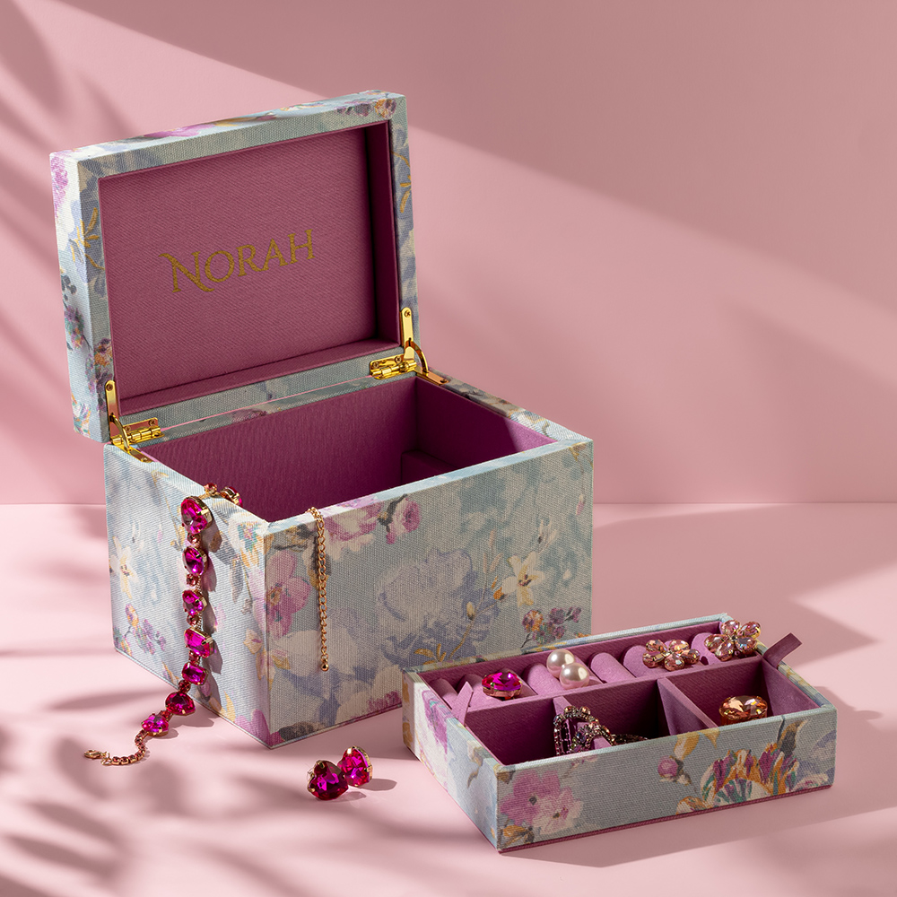 A cylindrical small vase contains mixed beautiful artificial flowers.