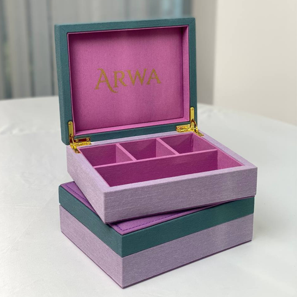A mini Emerald jewelry box from the Quartz collection, covered in luxurious fabric in shades of dark and light purple with a touch of elegant green. Note: only one box comes with the gift.