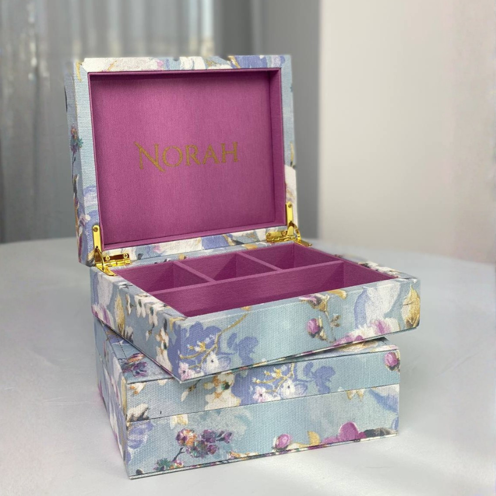 A mini Turquoise jewelry box from the Quartz collection, covered in luxurious sky-blue floral fabric with pink accents. Note: only one box comes with the gift.