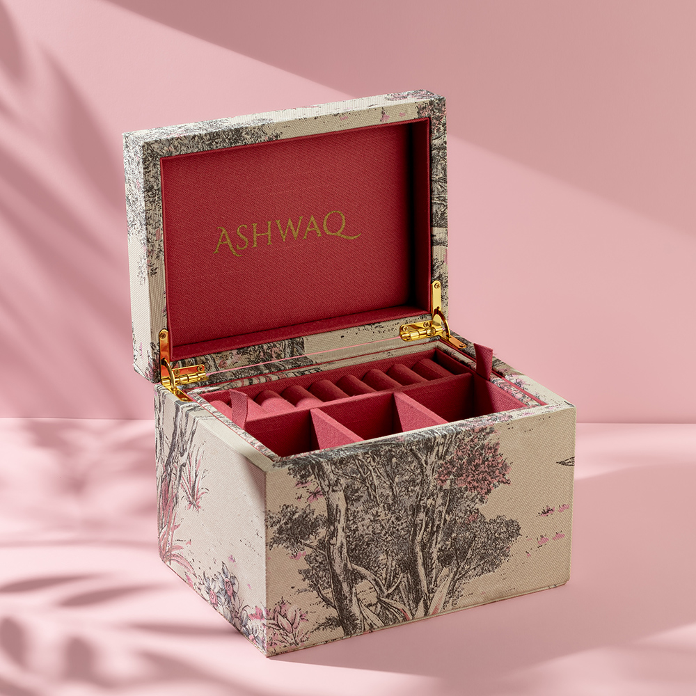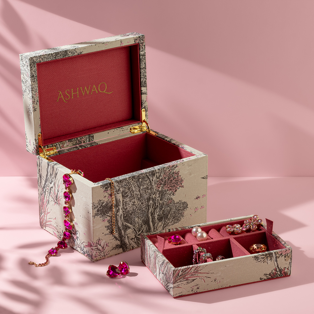 A tourmaline jewelry box from the Quartz collection, covered in luxurious fabric in shades of off-white and black with an elegant pink touch.