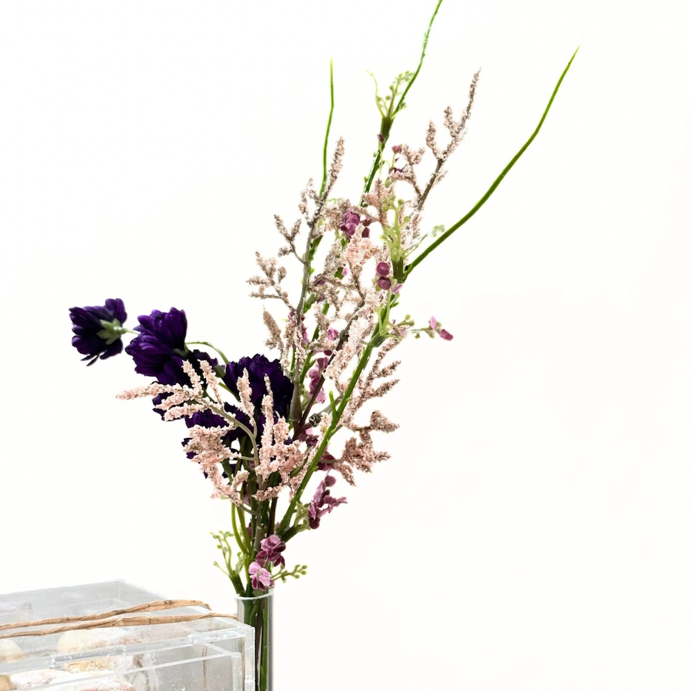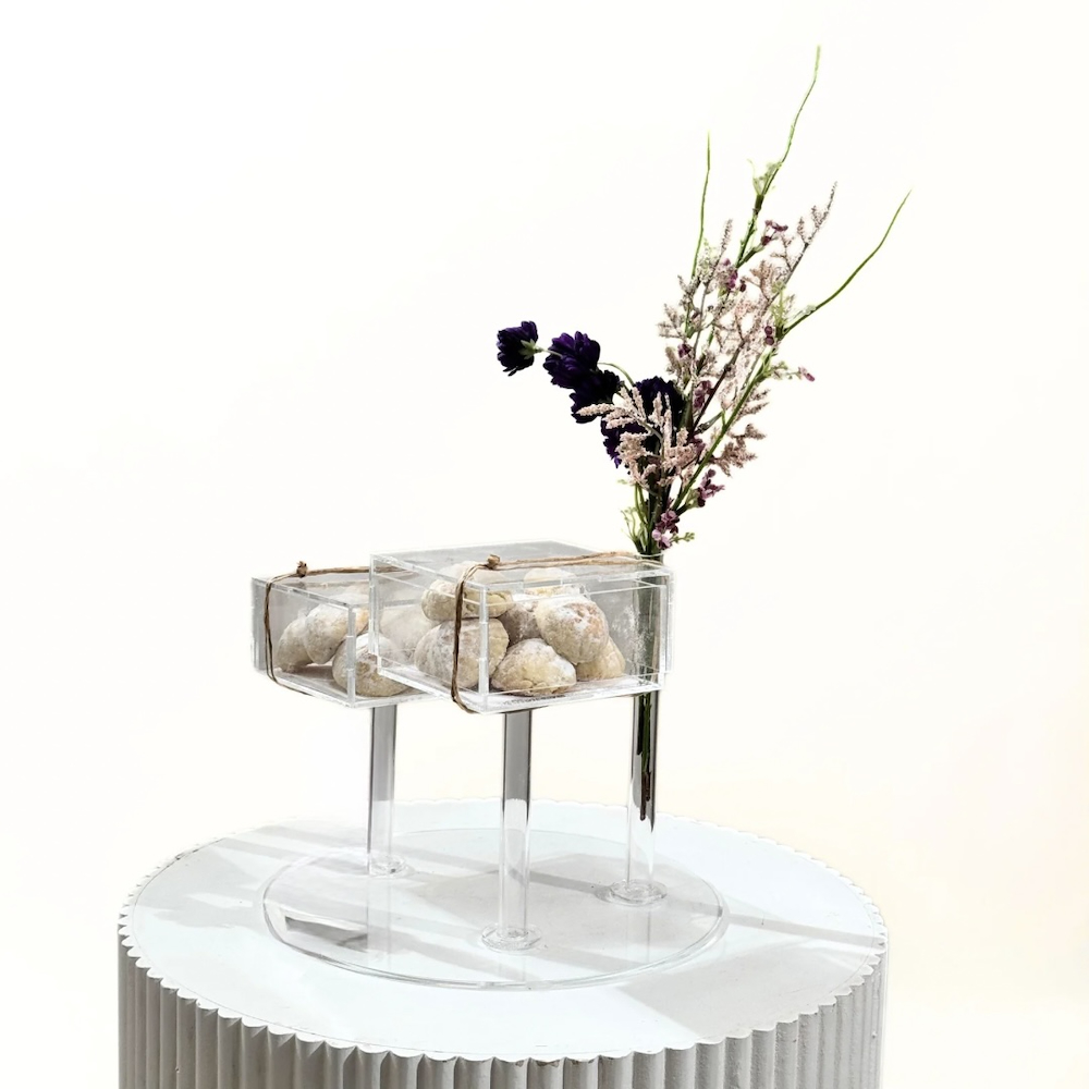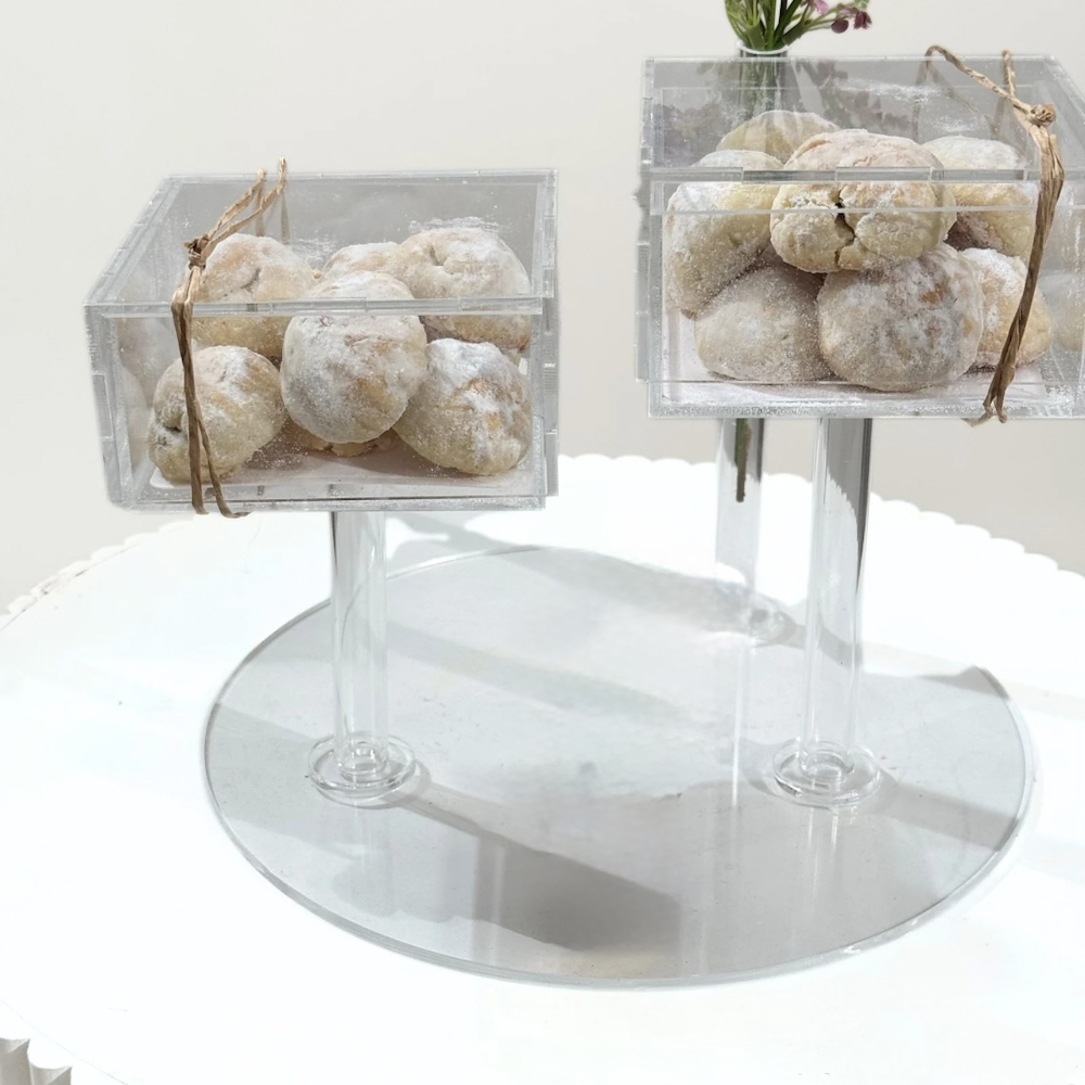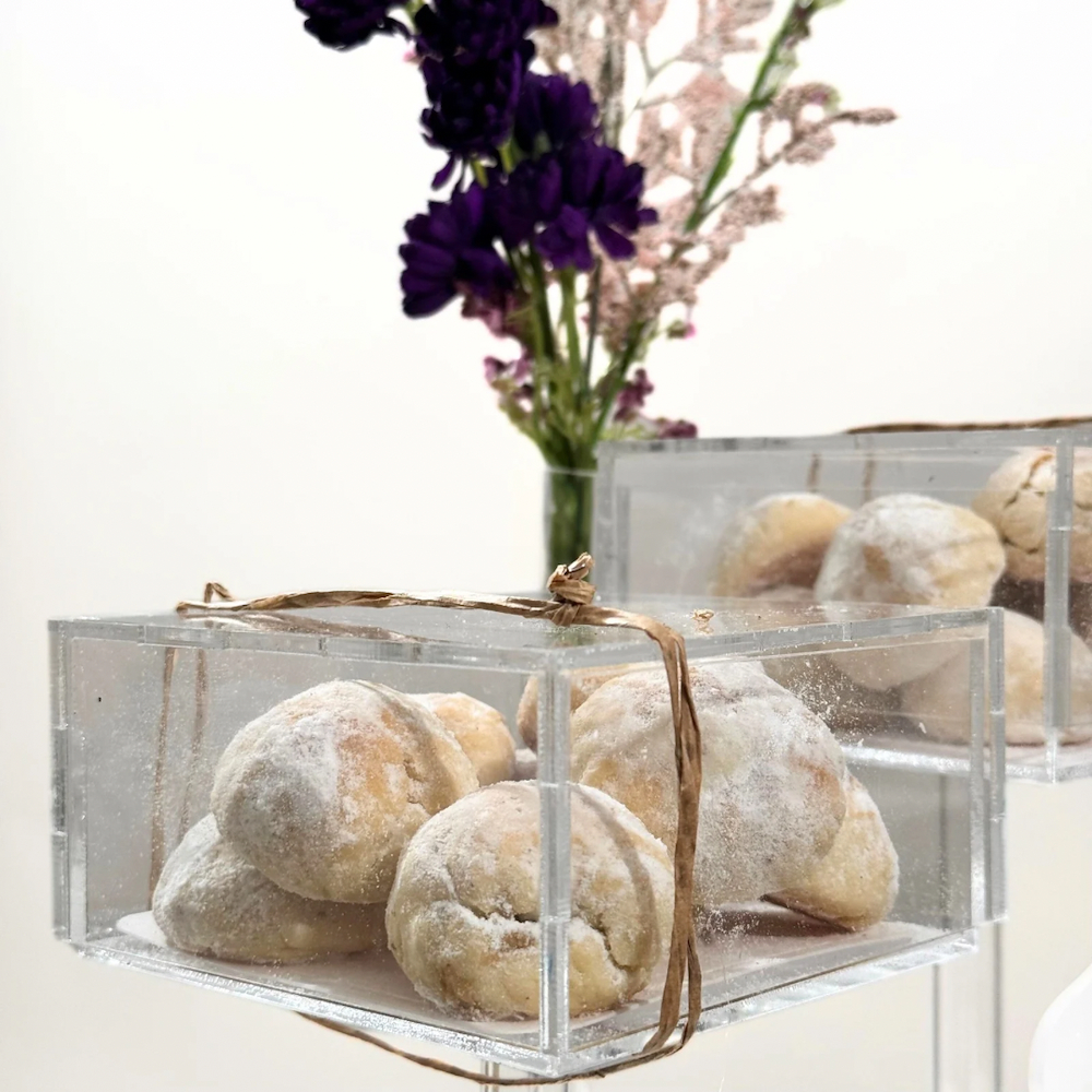 A tray filled with artificial flowers with 20 nut-filled ma'amoul in acrylic box.