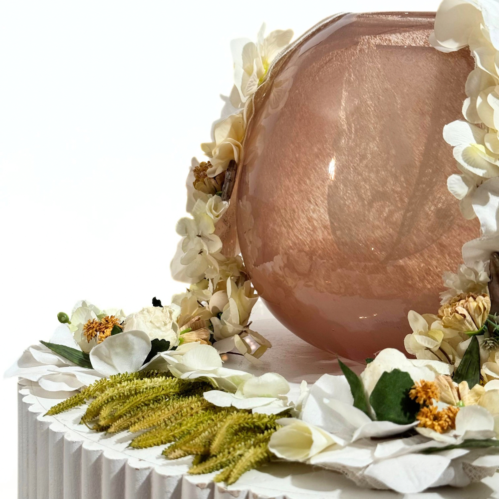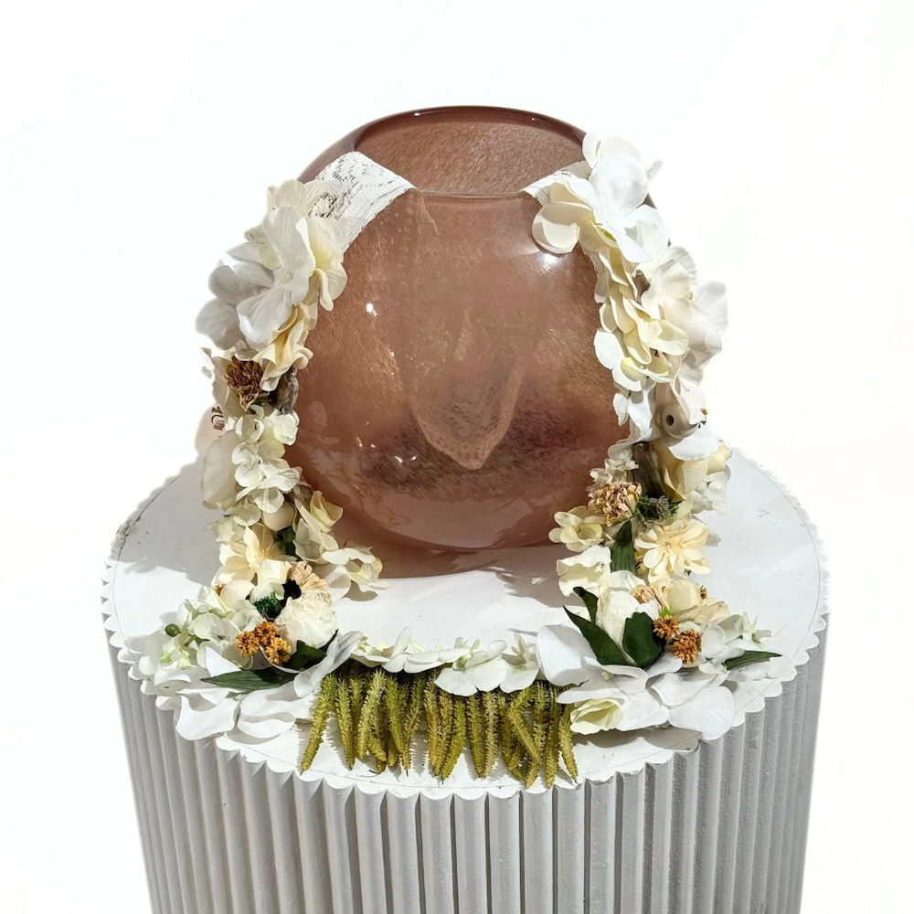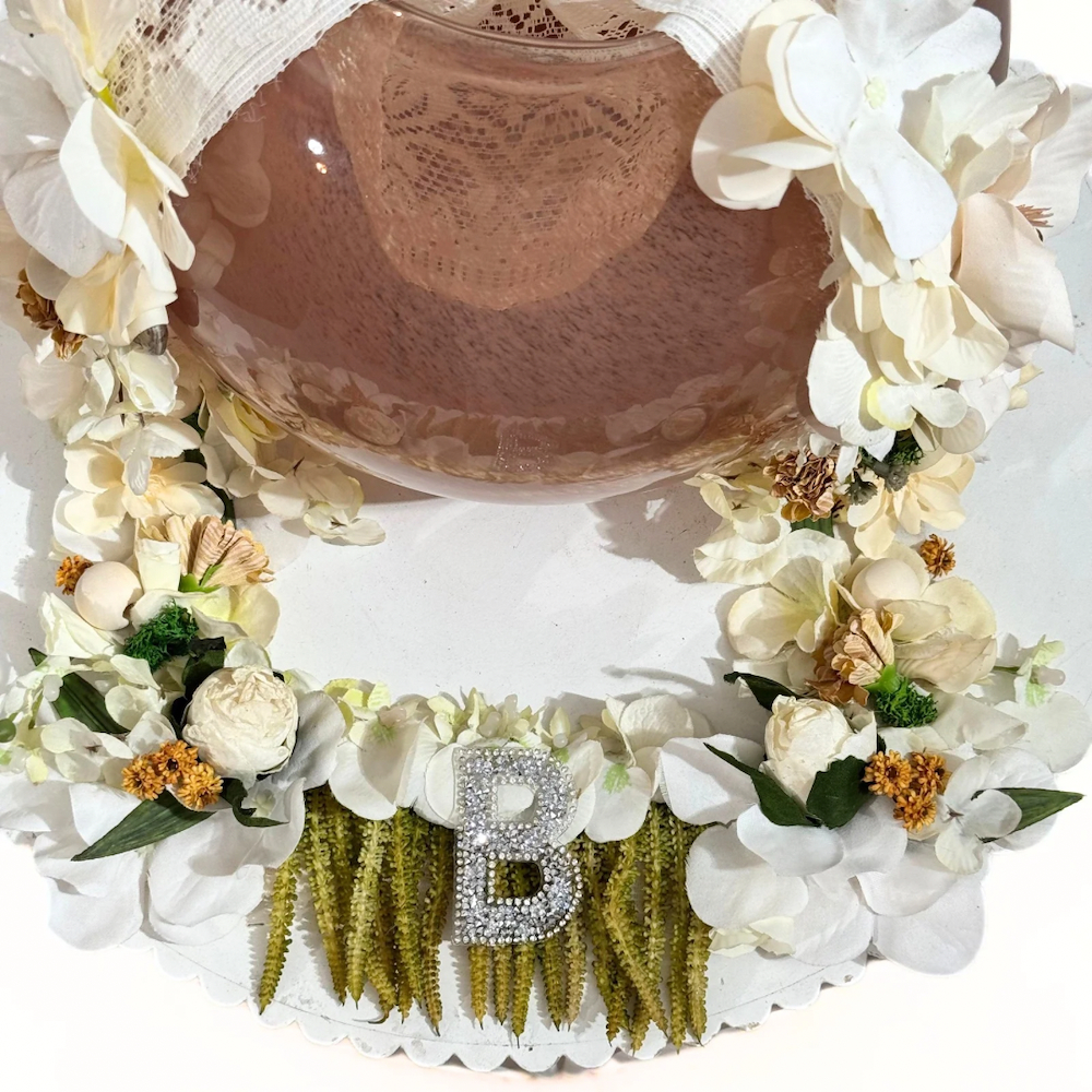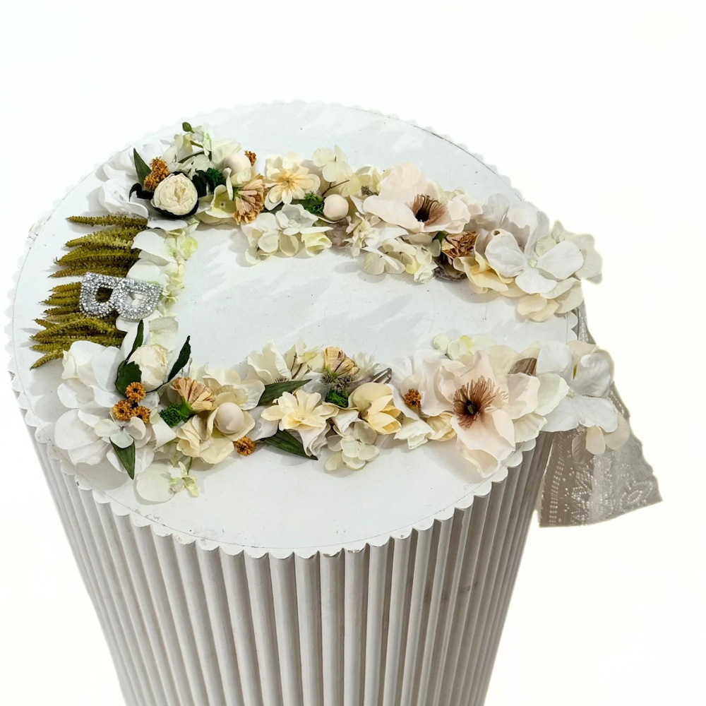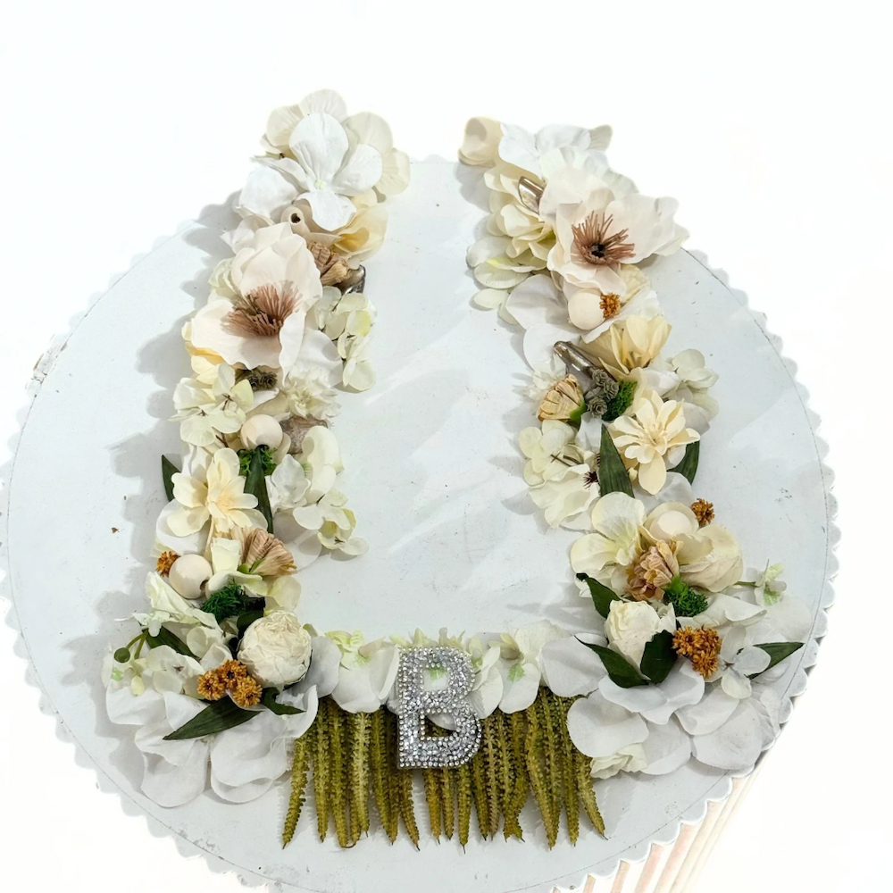 A delicate and feminine graduation necklace, featuring artificial plants in shades of white and beige with green details, harmoniously distributed around the neck with delicate lace accents, exuding both luxury and simplicity. Perfect for showcasing your free time and your special day. Note: Please select your letter when purchasing the product.