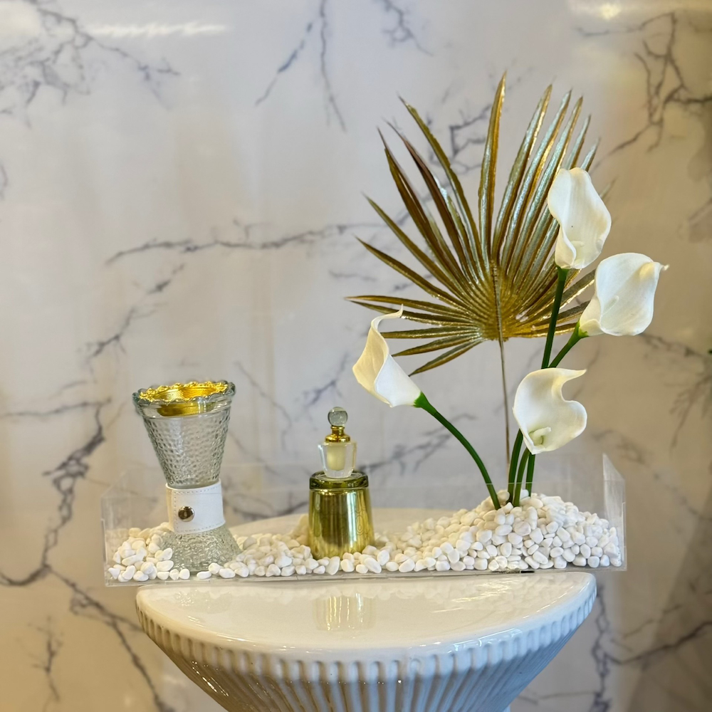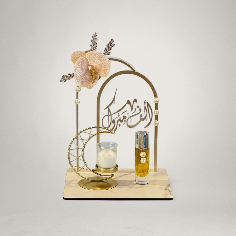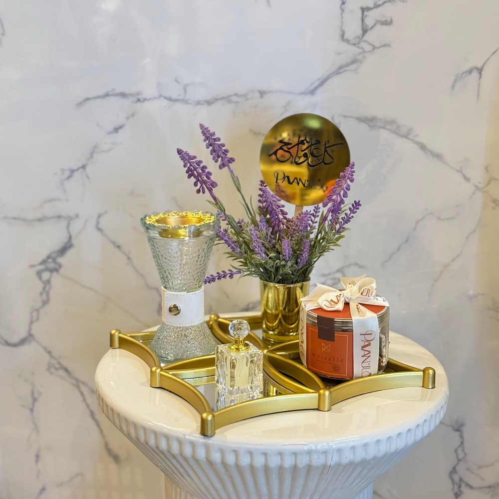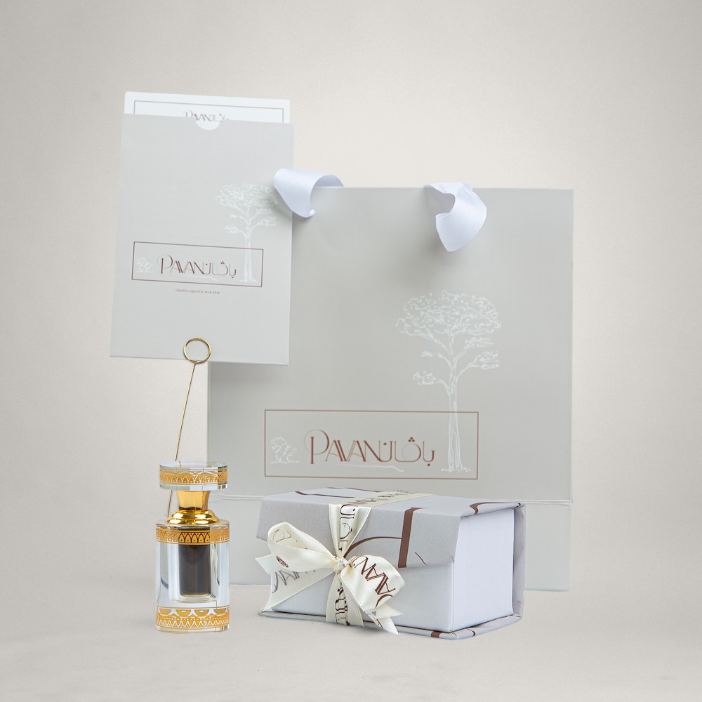 A stand with a 50 ml perfume in patchouli and jasmine fragrance and a candle.