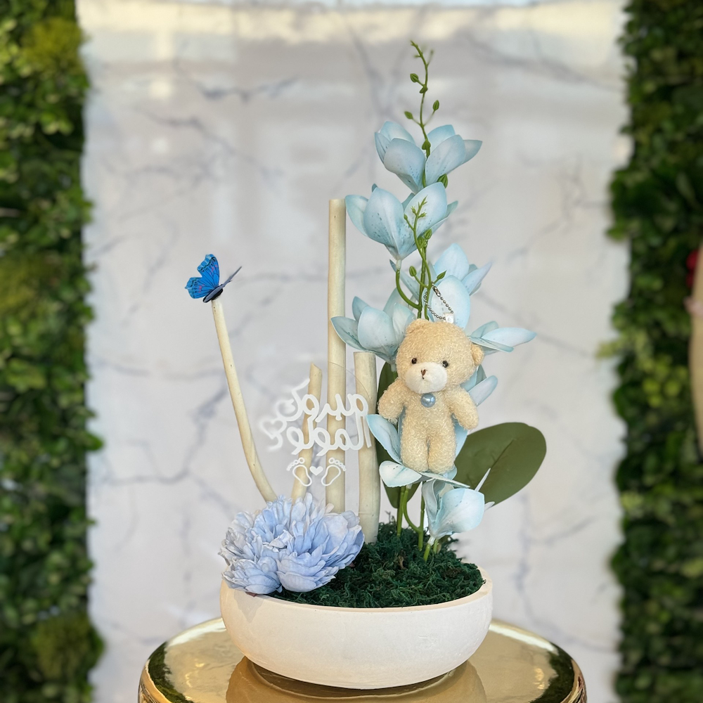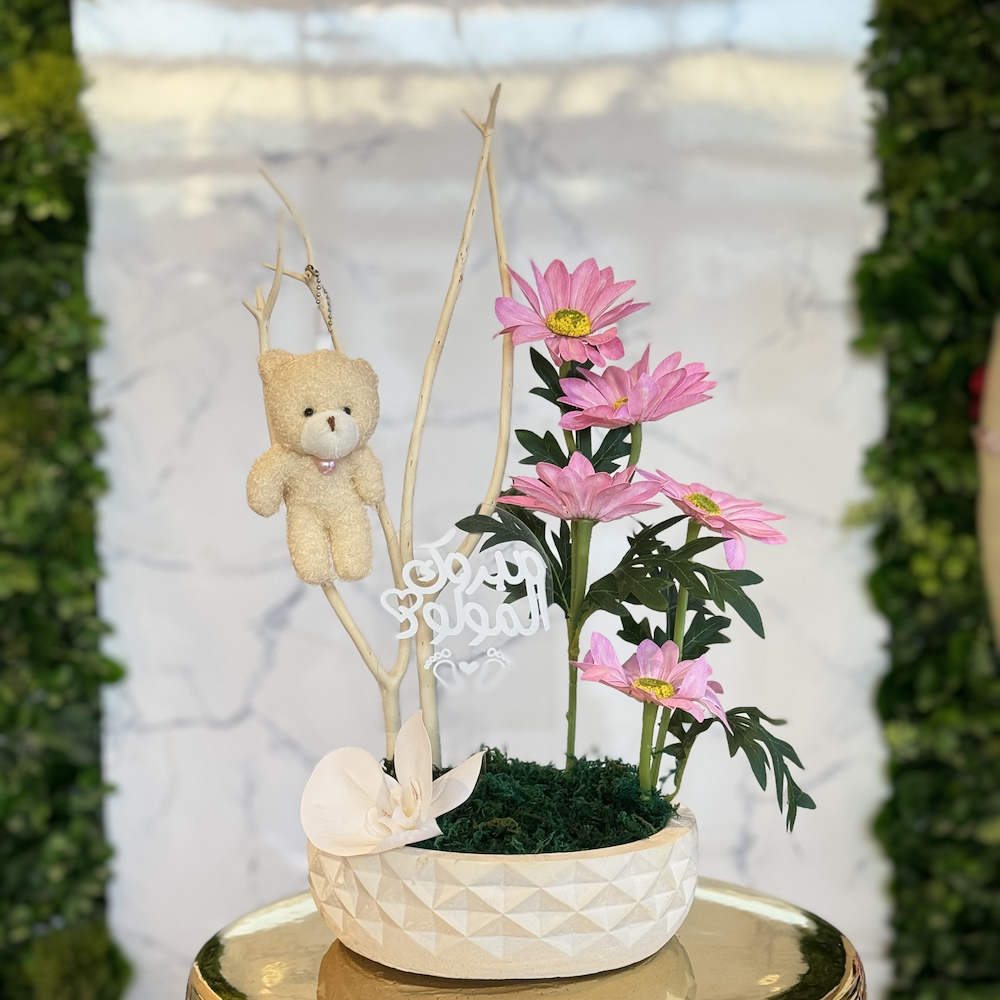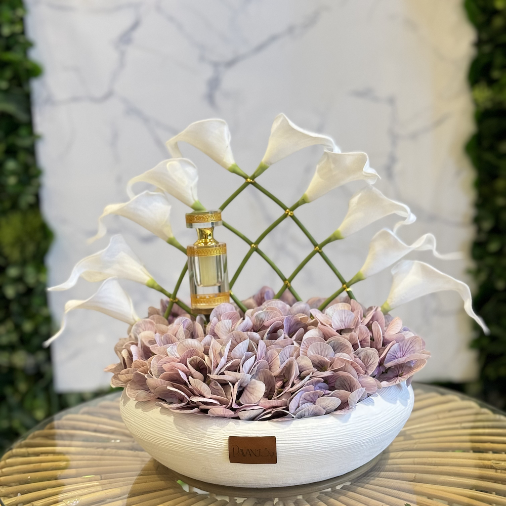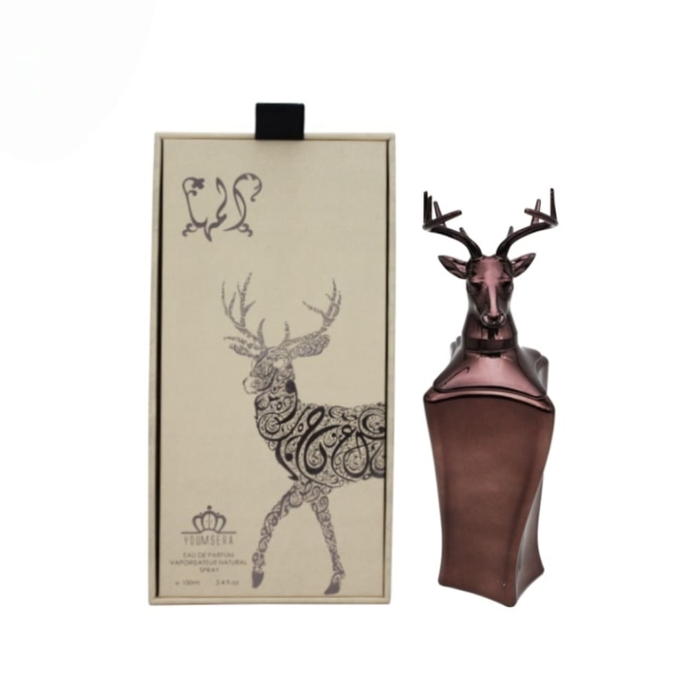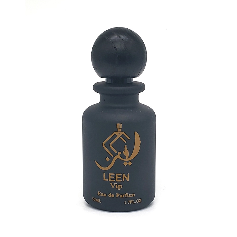 A stand with a 50 ml perfume in patchouli and jasmine fragrance and a candle.