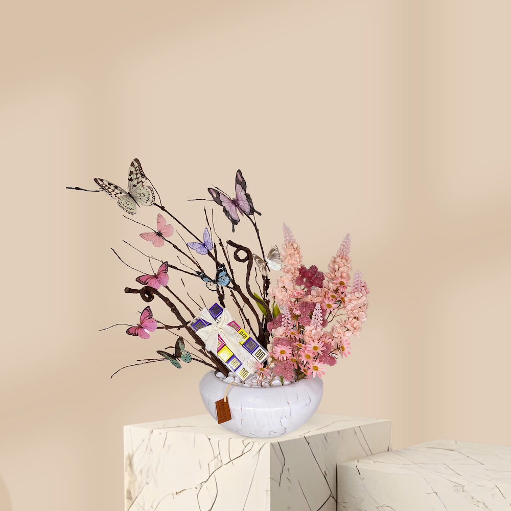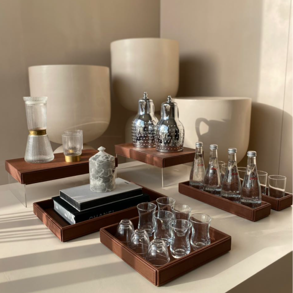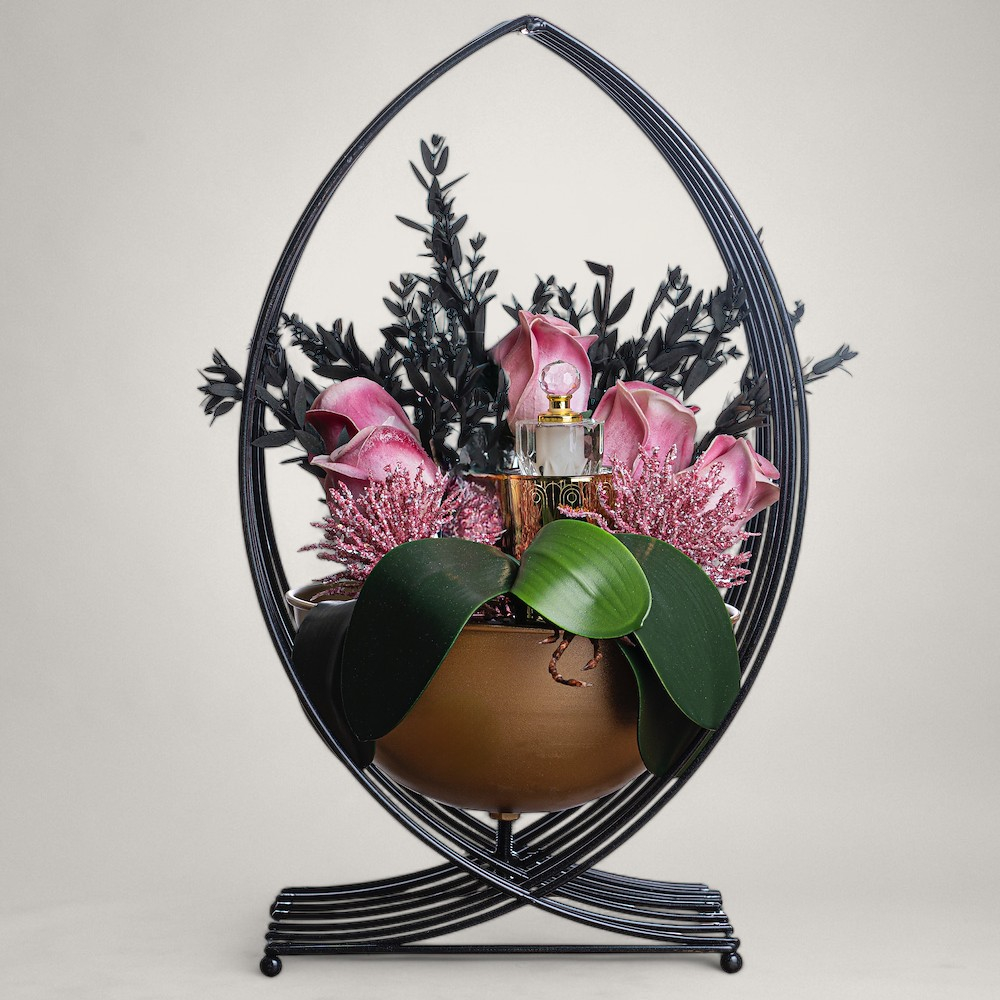 A luxurious leather box that contains artificial flowers with a fish in a vase.